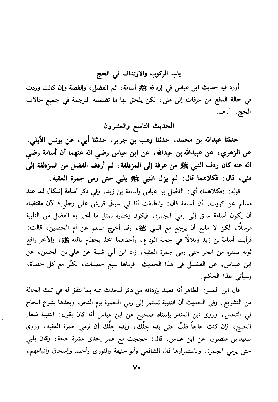 حَدَّثَنَا عَبْدُ اللَّهِ بْنُ مُحَمَّدٍ، حَدَّثَنَا وَهْبُ بْنُ جَرِيرٍ، حَدَّثَنَا أَبِي، عَنْ يُونُسَ الأَيْلِيِّ، عَنِ الزُّهْرِيِّ، عَنْ عُبَيْدِ اللَّهِ بْنِ عَبْدِ اللَّهِ، عَنِ ابْنِ عَبَّاسٍ رضي الله عنهما أَنَّ أُسَامَةَ رضي الله عنه كَانَ رِدْفَ النَّبِيِّ -صلى الله عليه وسلم- مِنْ عَرَفَةَ إِلَى الْمُزْدَلِفَةِ، ثُمَّ أَرْدَفَ الْفَضْلَ مِنَ الْمُزْدَلِفَةِ إِلَى مِنًى. قَالَ: فَكِلاَهُمَا قَالَ: لَمْ يَزَلِ النَّبِيُّ -صلى الله عليه وسلم- يُلَبِّي، حَتَّى رَمَى جَمْرَةَ الْعَقَبَةِ.