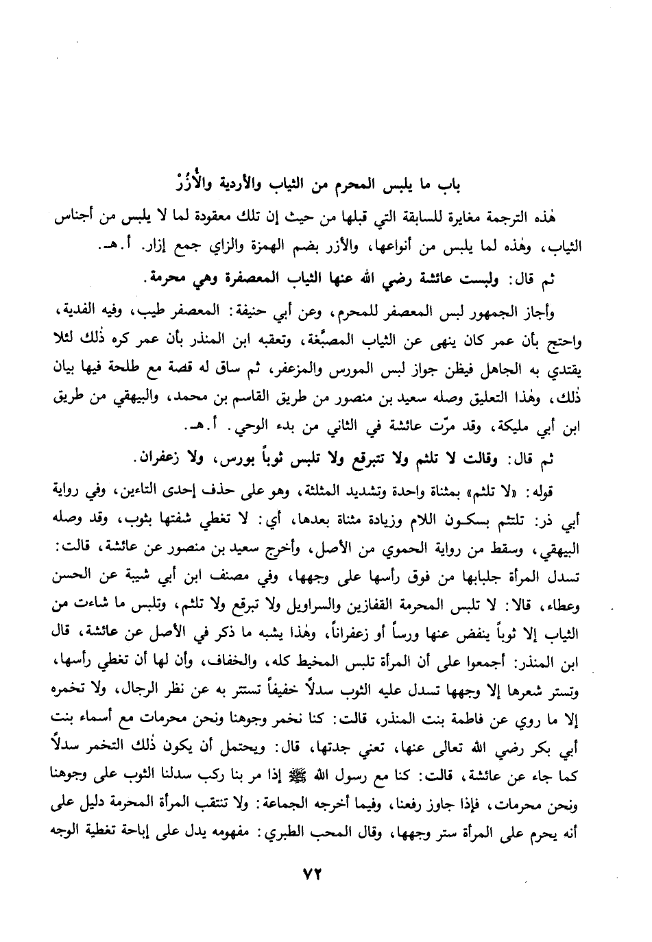 وأجاز الجمهور لبس المعصفر للمحرم، وعن أبي حنيفة: المعصفر طيب، وفيه الفدية، واحتج بأن عمر كان ينهى عن الثياب المصبَّغة، وتعقبه ابن المنذر بأن عمر كره ذلك لئلا يقتدي به الجاهل فيظن جواز لبس المورس والمزعفر، ثم ساق له قصة مع طلحة فيها بيان ذلك، وهذا التعليق وصله سعيد بن منصور من طريق القاسم بن محمد، والبيهقي من طريق ابن أبي مليكة، وقد مرّت عائشة في الثاني من بدء الوحي. أ. هـ.