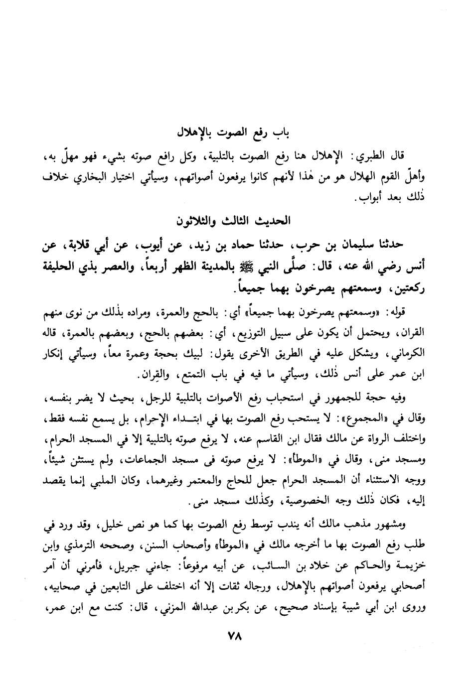 ومشهور مذهب مالك أنه يندب توسط رفع الصوت بها كما هو نص خليل، وقد ورد في طلب رفع الصوت بها ما أخرجه مالك في "الموطأ" وأصحاب السنن، وصححه الترمذي وابن خزيمة والحاكم عن خلاد بن السائب، عن أبيه مرفوعًا: جاءني جبريل، فأمرني أن آمر أصحابي يرفعون أصواتهم بالإِهلال، ورجاله ثقات إلا أنه اختلف على التابعين في صحابيه، وروى ابن أبي شيبة بإسناد صحيح، عن بكر بن عبد الله المزني، قال: كنت مع ابن عمر،
