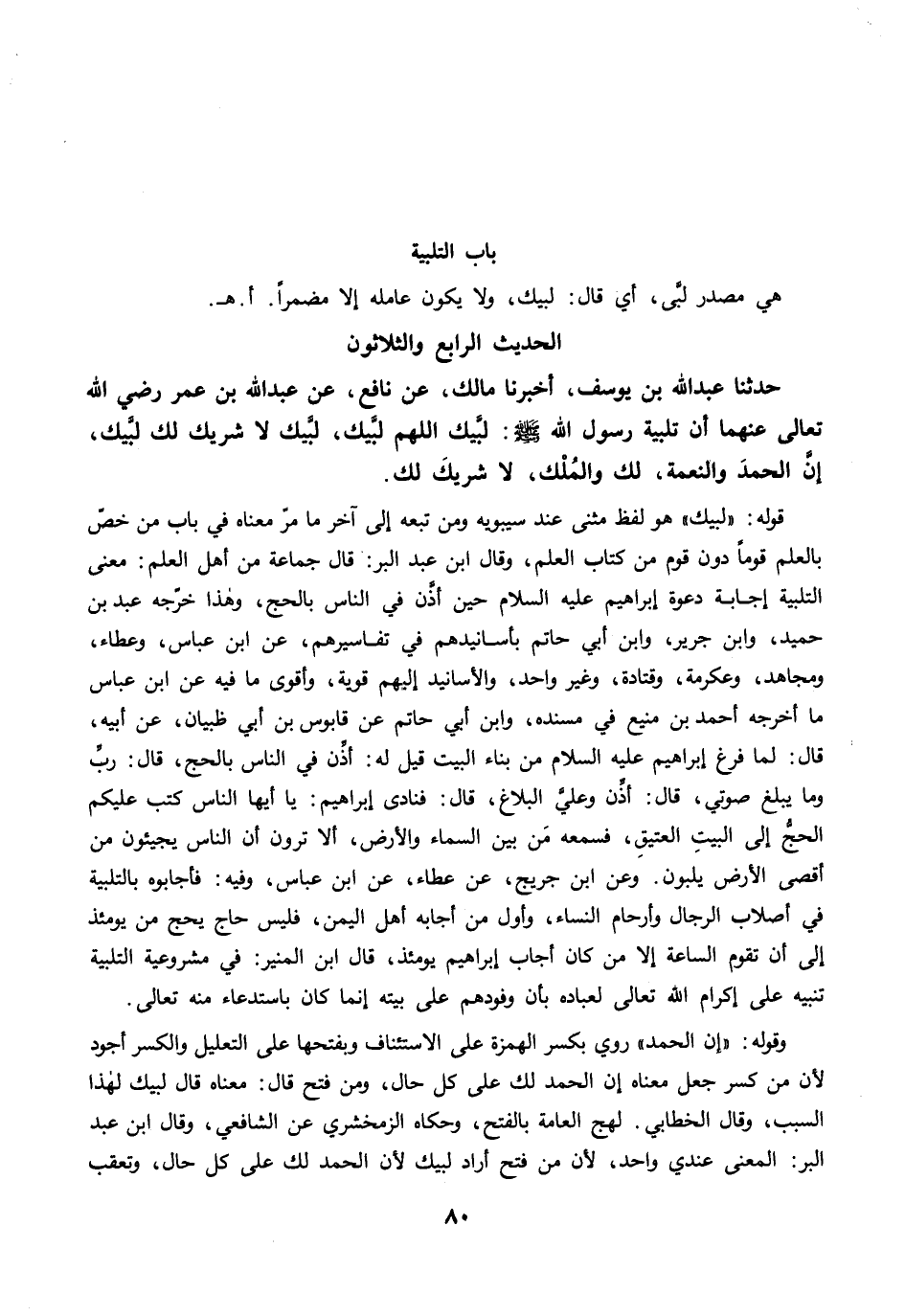 وقوله: "إن الحمد" روي بكسر الهمزة على الاستئناف وبفتحها على التعليل والكسر أجود لأن من كسر جعل معناه إن الحمد لك على كل حال، ومن فتح قال: معناه قال لبيك لهذا السبب، وقال الخطابي. لهج العامة بالفتح، وحكاه الزمخشري عن الشافعي، وقال ابن عبد البر: المعنى عندي واحد، لأن من فتح أراد لبيك لأن الحمد لك على كل حال، وتعقب