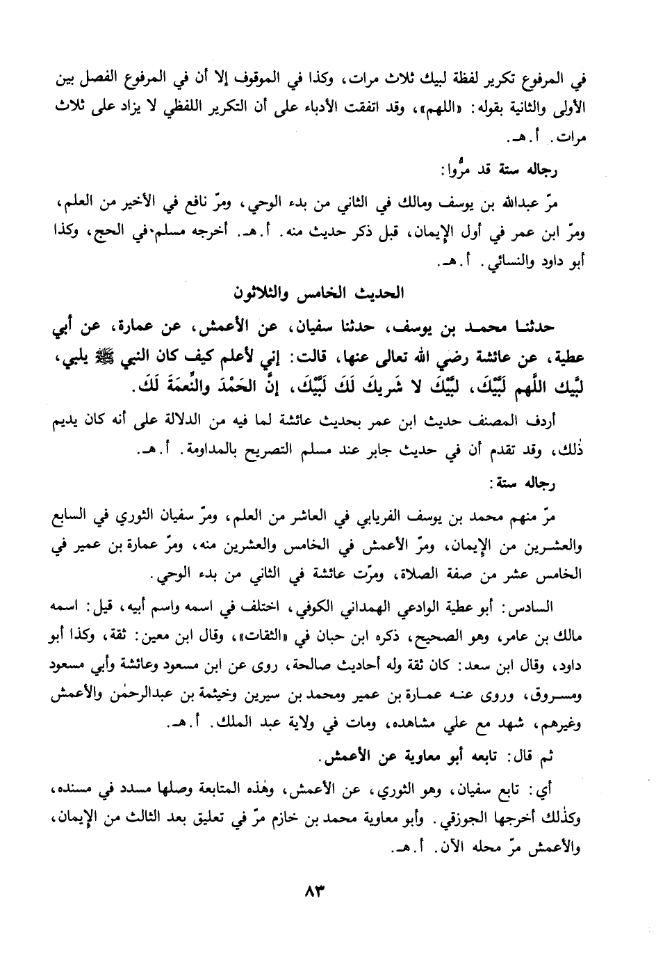 مرّ منهم محمد بن يوسف الفريابي في العاشر من العلم، ومرّ سفيان الثوري في السابع والعشرين من الإِيمان، ومرّ الأعمش في الخامس والعشرين منه، ومرّ عمارة بن عمير في الخامس عشر من صفة الصلاة، ومرّت عائشة في الثاني من بدء الوحي.