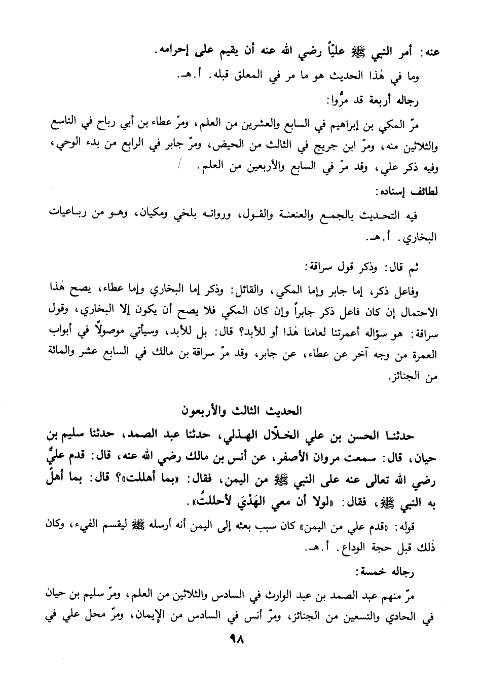 حَدَّثَنَا الْحَسَنُ بْنُ عَلِيٍّ الْخَلاَّلُ الْهُذَلِيُّ، حَدَّثَنَا عَبْدُ الصَّمَدِ، حَدَّثَنَا سَلِيمُ بْنُ حَيَّانَ، قَالَ: سَمِعْتُ مَرْوَانَ الأَصْفَرَ، عَنْ أَنَسِ بْنِ مَالِكٍ رضي الله عنه، قَالَ: قَدِمَ عَلِيٌّ رضي الله عنه عَلَى النَّبِيِّ -صلى الله عليه وسلم- مِنَ الْيَمَنِ فَقَالَ: "بِمَا أَهْلَلْتَ؟ ". قَالَ: بِمَا أَهَلَّ بِهِ النَّبِيُّ -صلى الله عليه وسلم-. فَقَالَ: "لَوْلاَ أَنَّ مَعِي الْهَدْيَ لأَحْلَلْتُ".