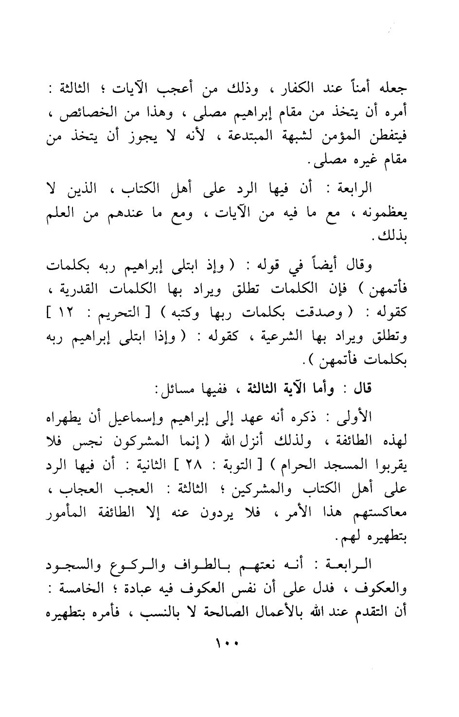 وقال أيضا في قوله: {وَإِذِ ابْتَلَى إِبْرَاهِيمَ رَبُّهُ بِكَلِمَاتٍ فَأَتَمَّهُنَّ} [سورة البقرة آية: 124] : فإن الكلمات تطلق ويراد بها الكلمات القدرية، كقوله: {وَصَدَّقَتْ بِكَلِمَاتِ رَبِّهَا وَكُتُبِهِ} [سورة التحريم آية: 12] ، وتطلق ويراد بها الشرعية، كقوله: {وَإِذِ ابْتَلَى إِبْرَاهِيمَ رَبُّهُ بِكَلِمَاتٍ فَأَتَمَّهُنَّ} [سورة البقرة آية: 124] . قال: وأما الآية الثالثة، ففيها مسائل:
