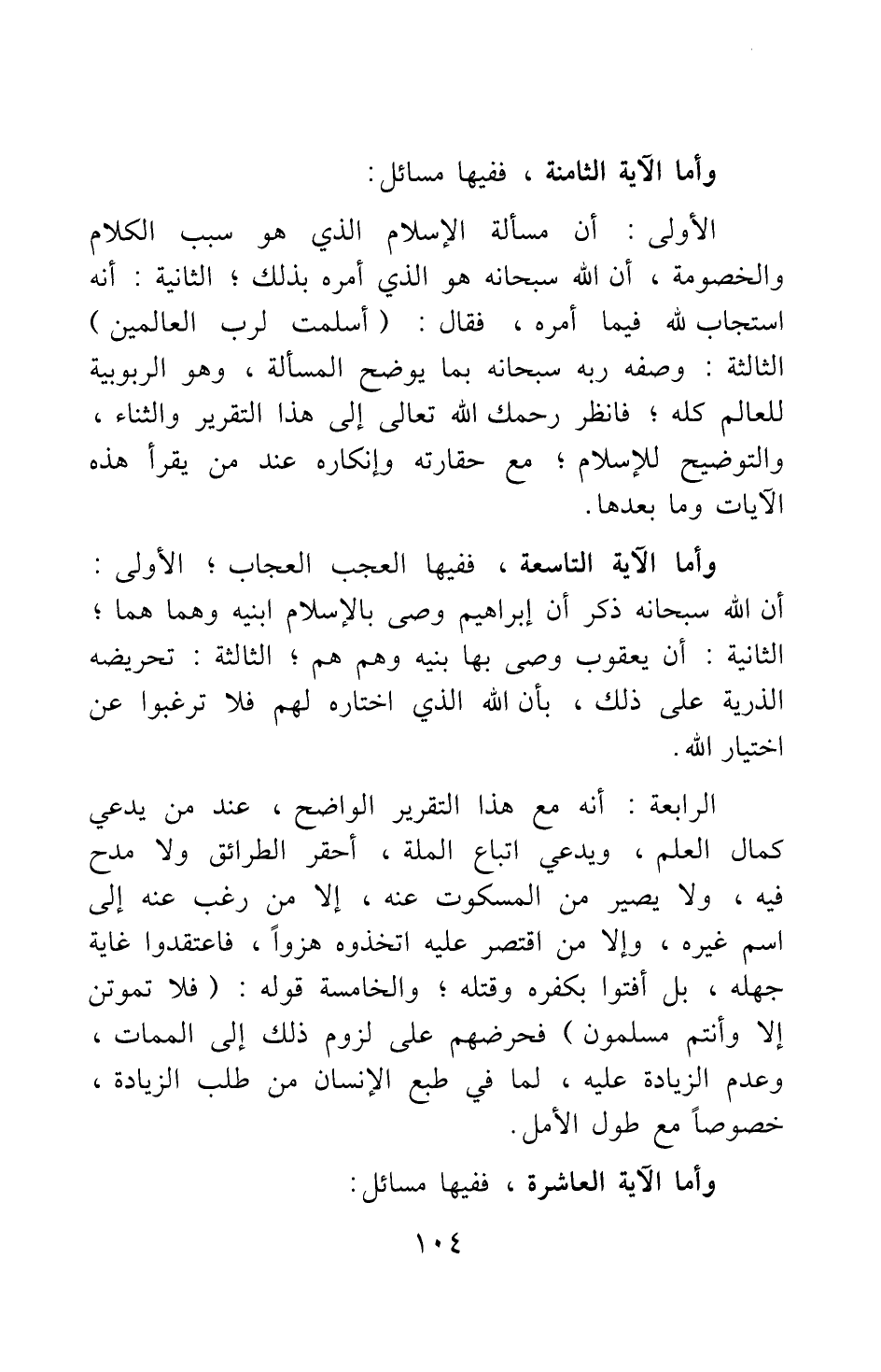 والخامسة: قوله: {فَلا تَمُوتُنَّ إِلاَّ وَأَنْتُمْ مُسْلِمُونَ} [سورة البقرة آية: 132] فحرضهم على لزوم ذلك إلى الممات، وعدم الزيادة عليه، لما في طبع الإنسان من طلب الزيادة، خصوصا مع طول الأمل.