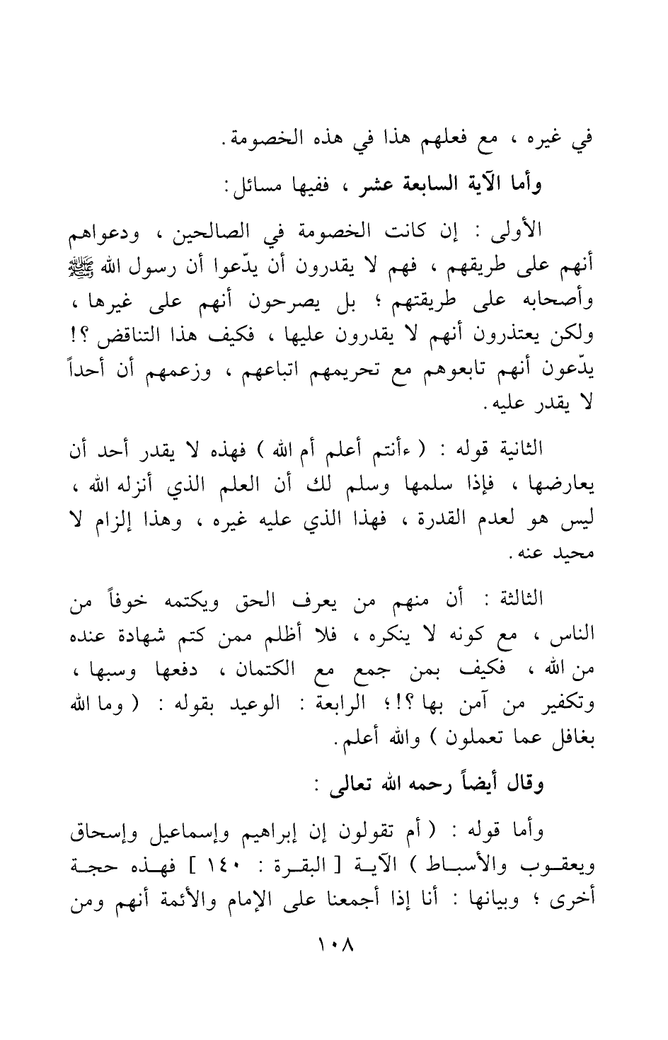 الثانية: قوله: {أَأَنْتُمْ أَعْلَمُ أَمِ اللَّهُ} [سورة البقرة آية: 140] فهذه لا يقدر أحد أن يعارضها، فإذا سلمها وسلم لك أن العلم الذي أنزله الله، ليس هو لعدم القدرة، فهذا الذي عليه غيره، وهذا إلزام لا محيد عنه.