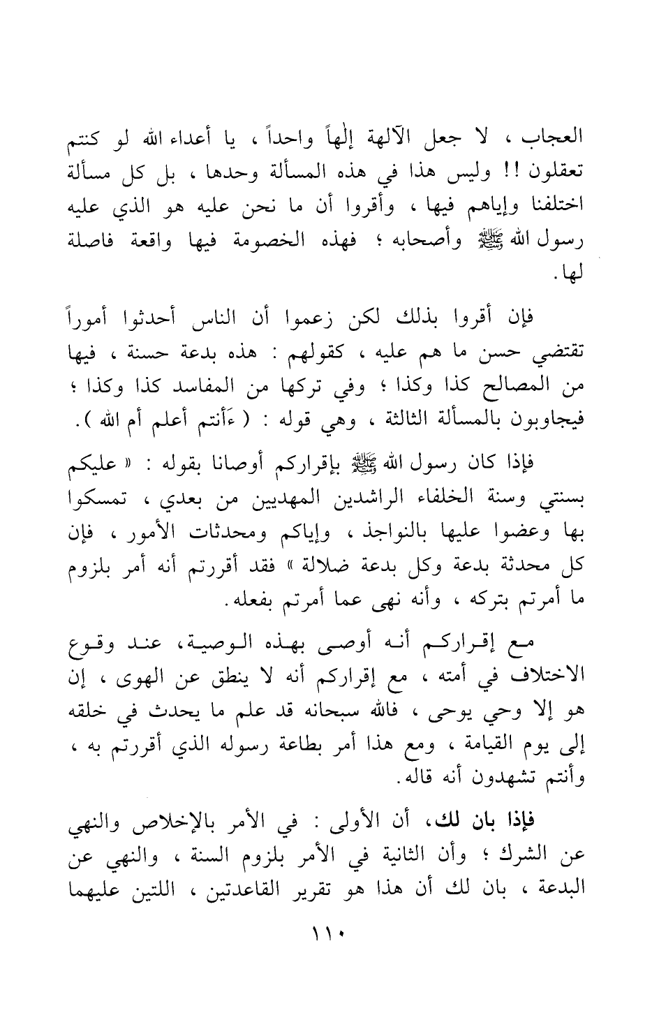فإذا بان لك أن الأولى في الأمر بالإخلاص والنهي عن الشرك، وأن الثانية في الأمر بلزوم السنة، والنهي عن البدعة، بان لك أن هذا هو تقرير القاعدتين اللتين عليهما