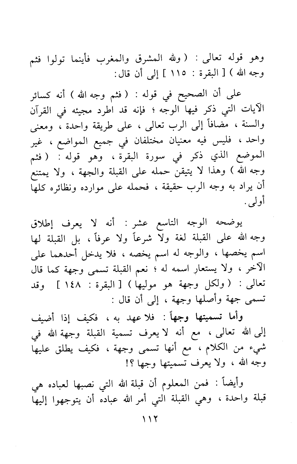 إلى أن قال: على أن الصحيح في قوله: {فَثَمَّ وَجْهُ اللَّهِ} [سورة البقرة آية: 115] أنه كسائر الآيات التي ذكر فيها الوجه ; فإنه قد اطرد مجيئه في القرآن والسنة مضافا إلى الرب تعالى على طريقة واحدة ومعنى واحد، فليس فيه معنيان مختلفان في جميع المواضع، غير الموضع الذي ذكر في سورة البقرة، وهو قوله: {فَثَمَّ وَجْهُ اللَّهِ} [سورة البقرة آية: 115] ، وهذا لا يتيقن حمله على القبلة والجهة، ولا يمتنع أن يراد به وجه الرب حقيقة، فحمله على موارده ونظائره كلها أولى؛