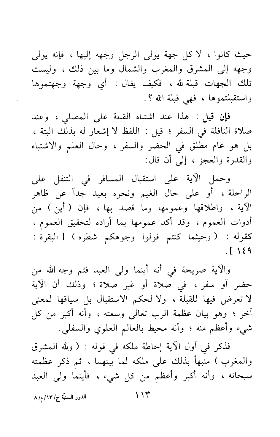 فإن قيل: هذا عند اشتباه القبلة على المصلي، وعند صلاة النافلة في السفر ; قيل: اللفظ لا إشعار له بذلك البتة، بل هو عام مطلق في الحضر والسفر، وحال العلم والاشتباه والقدرة والعجز، إلى أن قال: