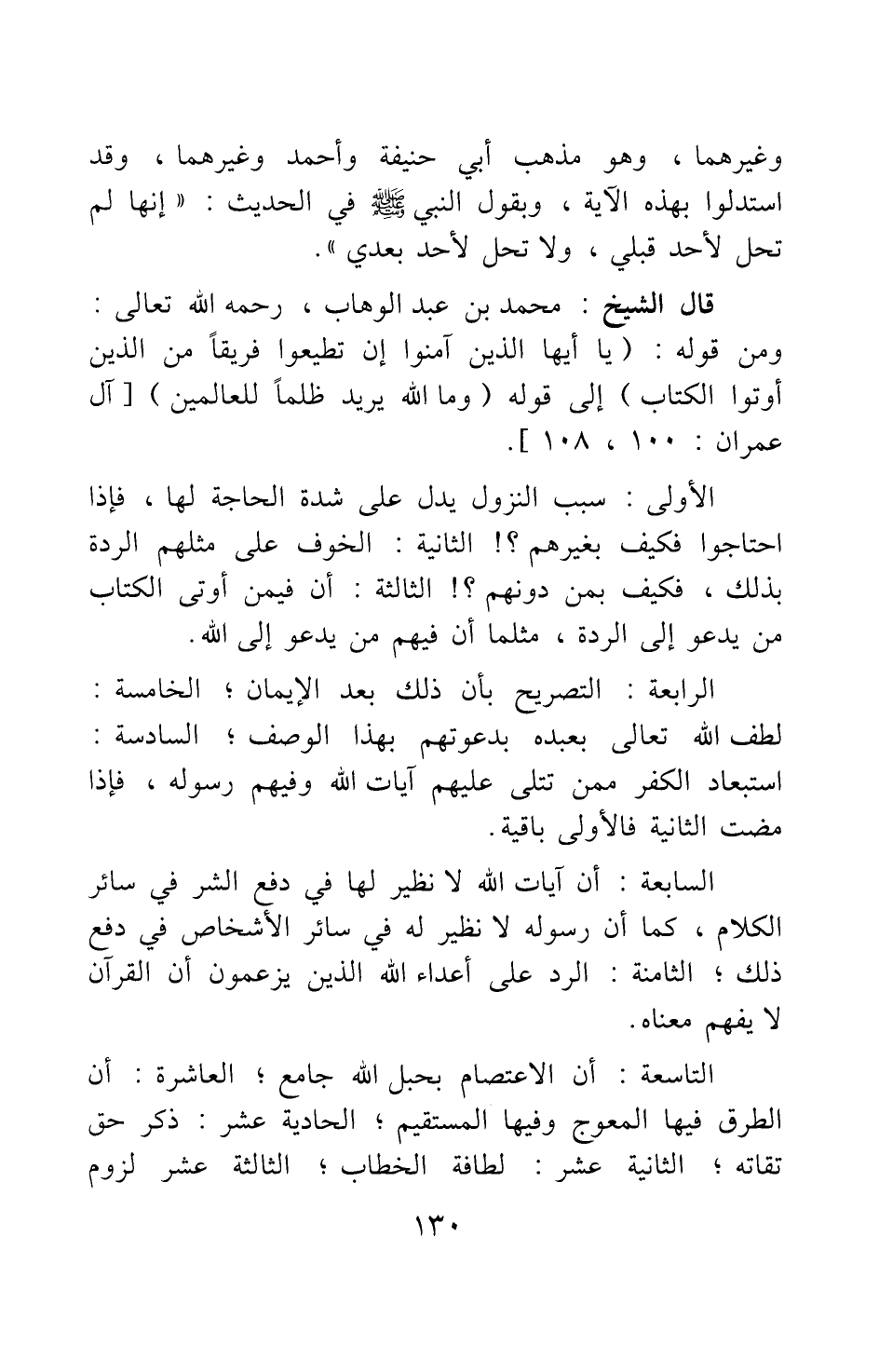 قال الشيخ محمد بن عبد الوهاب، رحمه الله تعالى: ومن قوله: {يَا أَيُّهَا الَّذِينَ آمَنُوا إِنْ تُطِيعُوا فَرِيقاً مِنَ الَّذِينَ أُوتُوا الْكِتَابَ [سورة آل عمران آية: 100] إلى قوله {وَمَا اللَّهُ يُرِيدُ ظُلْماً لِلْعَالَمِينَ} [سورة آل عمران آية: 108] .