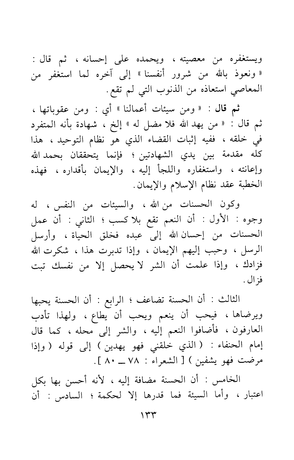 ثم قال: "ومن سيئات أعمالنا" أي: ومن عقوباتها، ثم قال: "من يهد الله فلا مضل له" إلخ: شهادة بأنه المتفرد في خلقه، ففيه إثبات القضاء الذي هو نظام التوحيد؛ هذا كله مقدمة بين يدي الشهادتين ; فإنما يتحققان بحمد الله وإعانته، واستغفاره واللجأ إليه، والإيمان بأقداره؛ فهذه الخطبة عقد نظام الإسلام والإيمان.