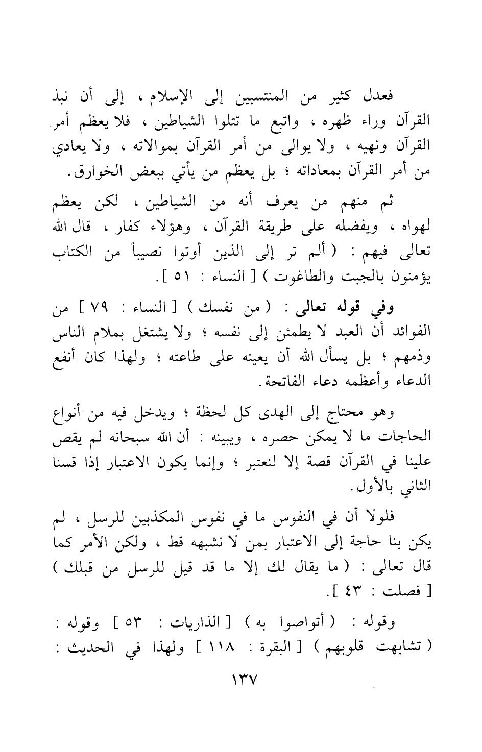 فعدل كثير من المنتسبين إلى الإسلام، إلى أن نبذ القرآن وراء ظهره، واتبع ما تتلو الشياطين، فلا يعظم أمر القرآن ونهيه، ولا يوالي من أمر القرآن بموالاته، ولا يعادي من أمر القرآن بمعاداته، بل يعظم من يأتي ببعض الخوارق. ثم منهم من يعرف أنه من الشياطين، لكن يعظم لهواه، ويفضله على طريقة القرآن، وهؤلاء كفار، قال الله تعالى فيهم: {أَلَمْ تَرَ إِلَى الَّذِينَ أُوتُوا نَصِيباً مِنَ الْكِتَابِ يُؤْمِنُونَ بِالْجِبْتِ وَالطَّاغُوتِ} [سورة النساء آية: 51] .