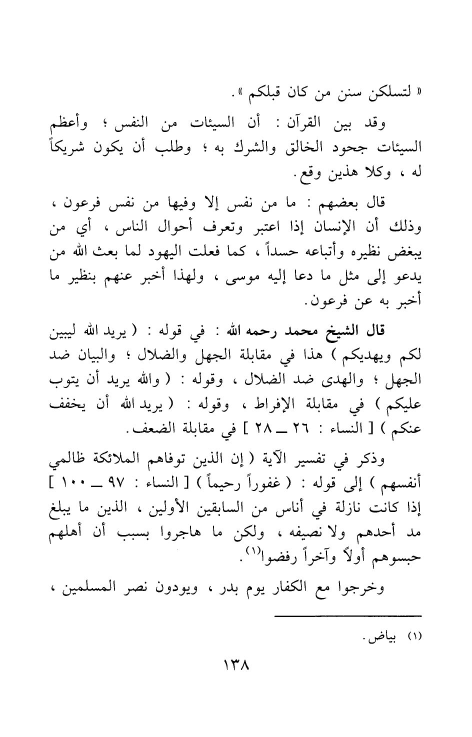 قال الشيخ محمد رحمه الله في قوله: {يُرِيدُ اللَّهُ لِيُبَيِّنَ لَكُمْ وَيَهْدِيَكُمْ} [سورة النساء آية: 26] : هذا في مقابلة الجهل والضلال ; والبيان ضد الجهل ; والهدى ضد الضلال؛ وقوله: {وَاللَّهُ يُرِيدُ أَنْ يَتُوبَ عَلَيْكُمْ} [سورة النساء آية: 27] في مقابلة الإفراط؛ وقوله: {يُرِيدُ اللَّهُ أَنْ يُخَفِّفَ عَنْكُمْ} [سورة النساء آية: 28] في مقابلة الضعف.