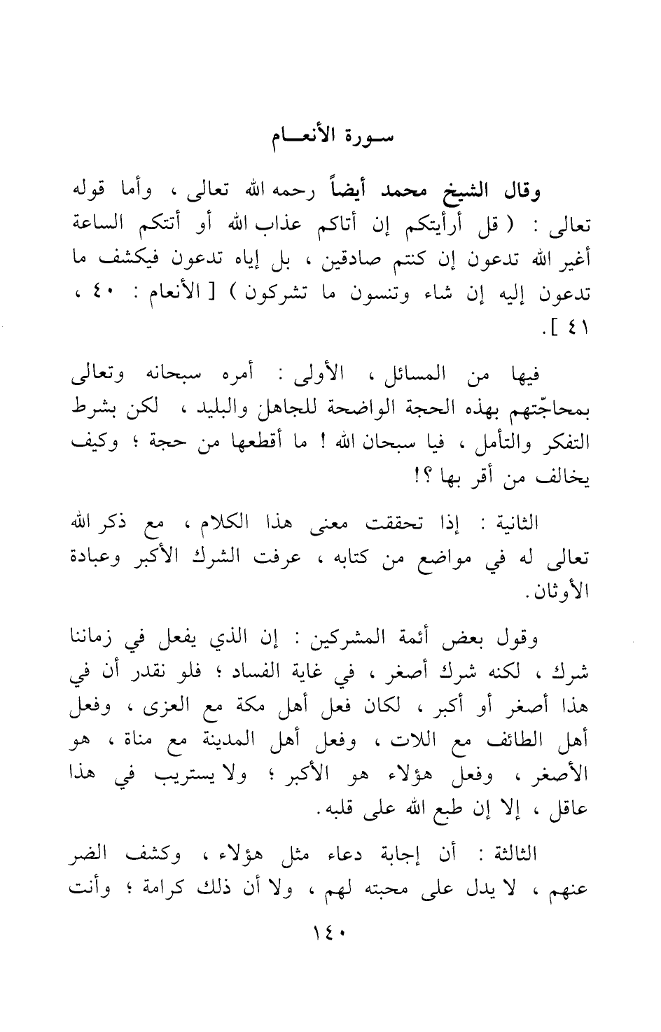 وقال الشيخ محمد أيضا رحمه الله تعالى: وأما قوله تعالى: {قُلْ أَرَأَيْتَكُمْ إِنْ أَتَاكُمْ عَذَابُ اللَّهِ أَوْ أَتَتْكُمُ السَّاعَةُ أَغَيْرَ اللَّهِ تَدْعُونَ إِنْ كُنْتُمْ صَادِقِينَ َلْ إِيَّاهُ تَدْعُونَ فَيَكْشِفُ مَا تَدْعُونَ إِلَيْهِ إِنْ شَاءَ وَتَنْسَوْنَ مَا تُشْرِكُونَ} [سورة الأنعام آية: 40] .