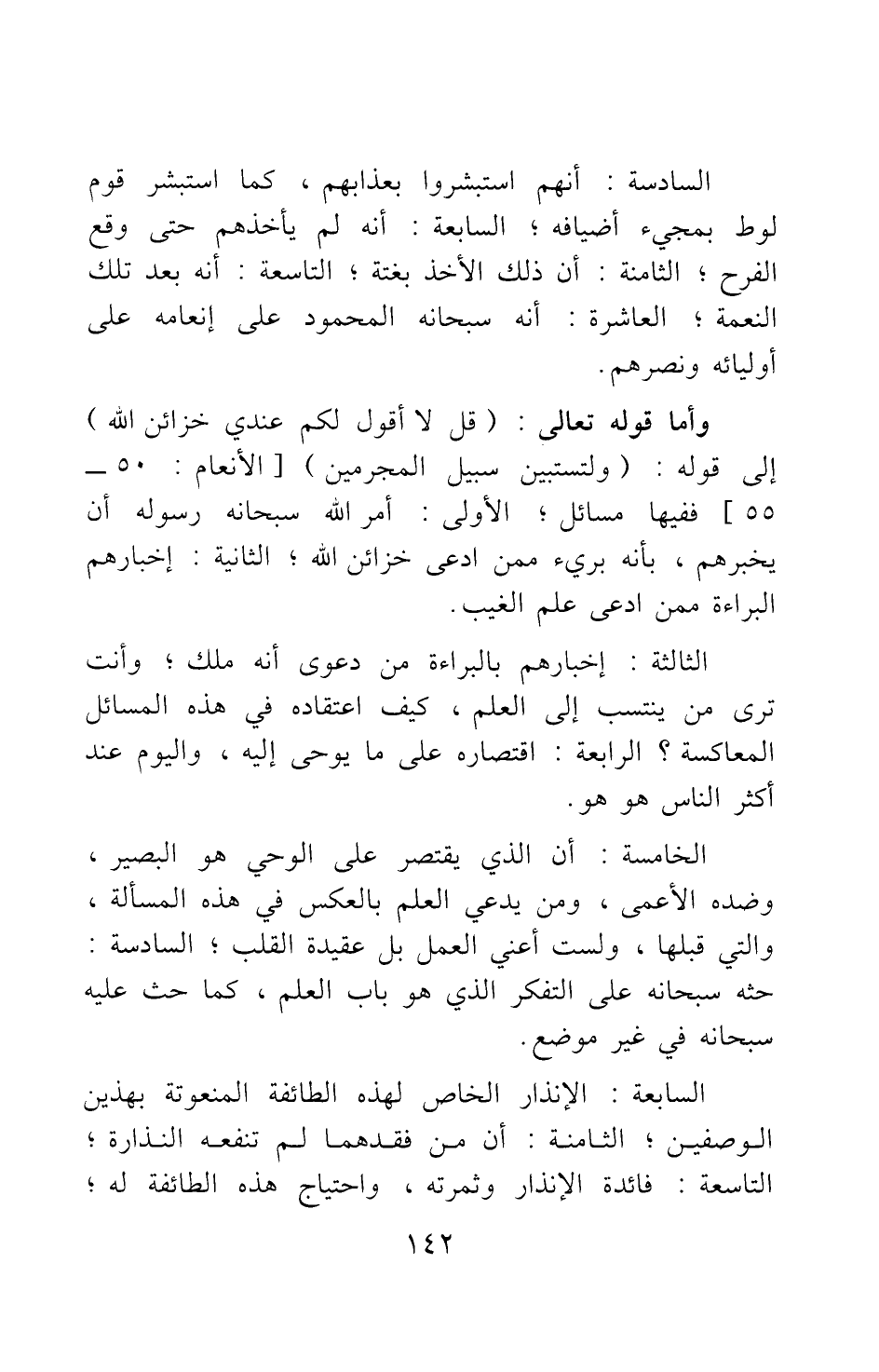 وأما قوله تعالى: {قُلْ لا أَقُولُ لَكُمْ عِنْدِي خَزَائِنُ اللَّهِ} [سورة الأنعام آية: 50] إلى قوله: {وَلِتَسْتَبِينَ سَبِيلُ الْمُجْرِمِينَ} [سورة الأنعام آية: 55] ففيها مسائل:
