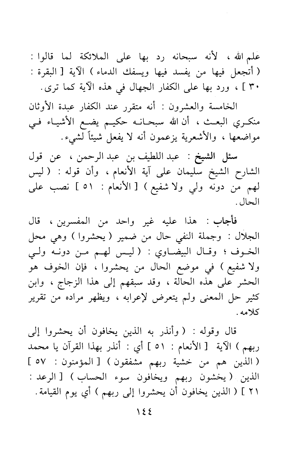 سئل الشيخ: عبد اللطيف بن عبد الرحمن، عن قول الشارح الشيخ سليمان على آية الأنعام، وأن قوله: {لَيْسَ لَهُمْ مِنْ دُونِهِ وَلِيٌّ وَلا شَفِيعٌ} [سورة الأنعام آية: 51] نصب على الحال.