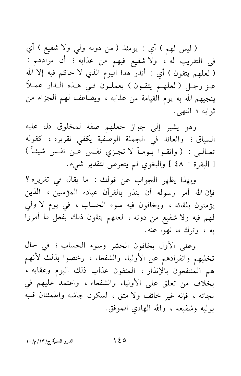 وبهذا يظهر الجواب عن قولك: ما يقال في تقريره؟ فإن الله أمر رسوله أن ينذر بالقرآن عباده المؤمنين الذين يؤمنون بلقائه، ويخافون فيه سوء الحساب، في يوم لا ولي لهم فيه ولا شفيع من دونه، لعلهم يتقون ذلك بفعل ما أمروا به وترك ما نهوا عنه.