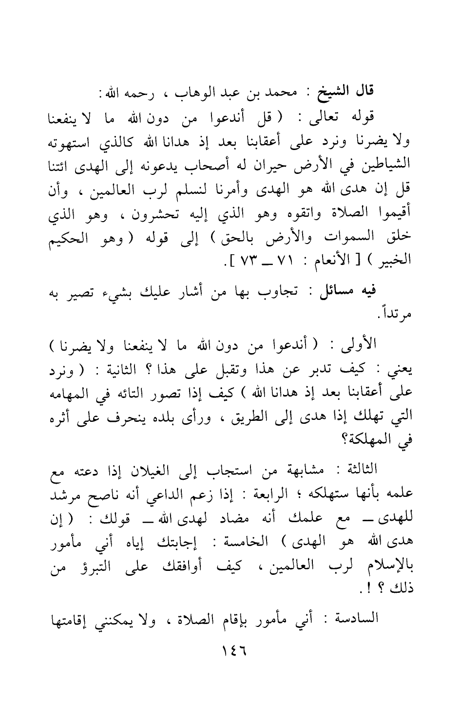 قال الشيخ: محمد بن عبد الوهاب، رحمه الله: قوله تعالى: {قُلْ أَنَدْعُو مِنْ دُونِ اللَّهِ مَا لا يَنْفَعُنَا وَلا يَضُرُّنَا وَنُرَدُّ عَلَى أَعْقَابِنَا بَعْدَ إِذْ هَدَانَا اللَّهُ كَالَّذِي اسْتَهْوَتْهُ الشَّيَاطِينُ فِي الْأَرْضِ حَيْرَانَ لَهُ أَصْحَابٌ يَدْعُونَهُ إِلَى الْهُدَى ائْتِنَا قُلْ إِنَّ هُدَى اللَّهِ هُوَ الْهُدَى وَأُمِرْنَا لِنُسْلِمَ لِرَبِّ الْعَالَمِينَ وَأَنْ أَقِيمُوا الصَّلاةَ وَاتَّقُوهُ وَهُوَ الَّذِي إِلَيْهِ تُحْشَرُونَ وَهُوَ الَّذِي خَلَقَ السَّمَاوَاتِ وَالْأَرْضَ بِالْحَقِّ} [سورة الأنعام آية: 71] إلى قوله {وَهُوَ الْحَكِيمُ الْخَبِيرُ} [سورة الأنعام آية: 73] .