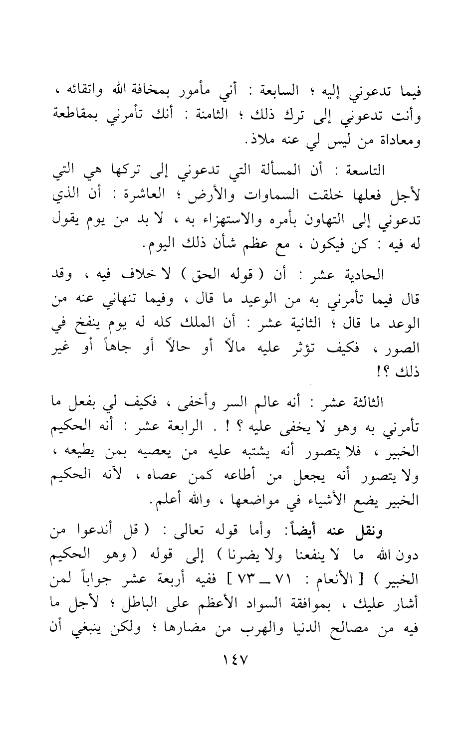 ونقل عنه أيضا: وأما قوله تعالى: {أَنَدْعُو مِنْ دُونِ اللَّهِ مَا لا يَنْفَعُنَا وَلا يَضُرُّنَا} [سورة الأنعام آية: 71] إلى قوله {وَهُوَ الْحَكِيمُ الْخَبِيرُ} [سورة الأنعام آية: 18] ، ففيه أربعة عشر جوابا لمن أشار عليك، بموافقة السواد الأعظم على الباطل، لأجل ما فيه من مصالح الدنيا والهرب من مضارها؛ ولكن ينبغي أن
