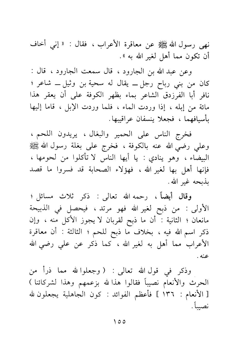 وعن عبد الله بن الجارود، قال سمعت الجارود، قال: "كان من بني رباح رجل - يقال لى سحية بن وثيل - شاعر نافر أبا الفرزدق الشاعر بماء بظهر الكوفة، على أن يعقر هذا مائة من إبله إذا وردت الماء. فلما وردت الإبل، قاما إليها بأسيافهما، فجعلا ينسفان عراقيبها. فخرج الناس على الحمير والبغال، يريدون اللحم، وعلي رضي الله عنه بالكوفة. فخرج على بغلة رسول الله صلى الله عليه وسلم البيضاء، وهو ينادي: يا أيها الناس لا تأكلوا من لحومها، فإنها أهل بها لغير الله"، فهؤلاء الصحابة قد فسروا ما قصد بذبحه غير الله.