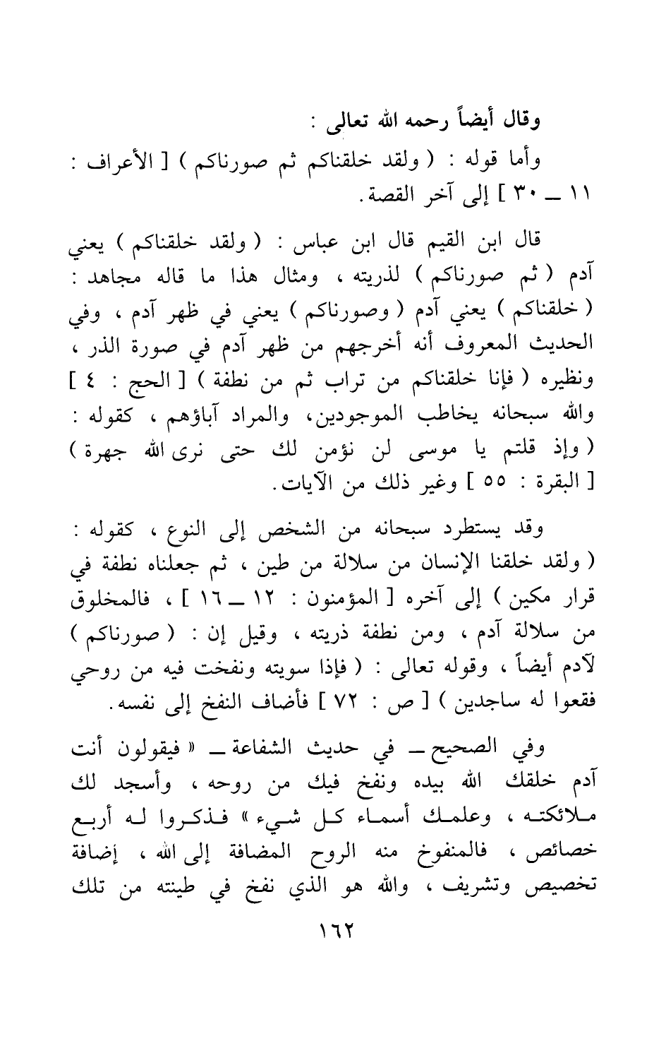 وقال أيضا رحمه الله تعالى: وأما قوله: {وَلَقَدْ خَلَقْنَاكُمْ ثُمَّ صَوَّرْنَاكُمْ} [سورة الأعراف آية: 11] إلى آخر القصة.