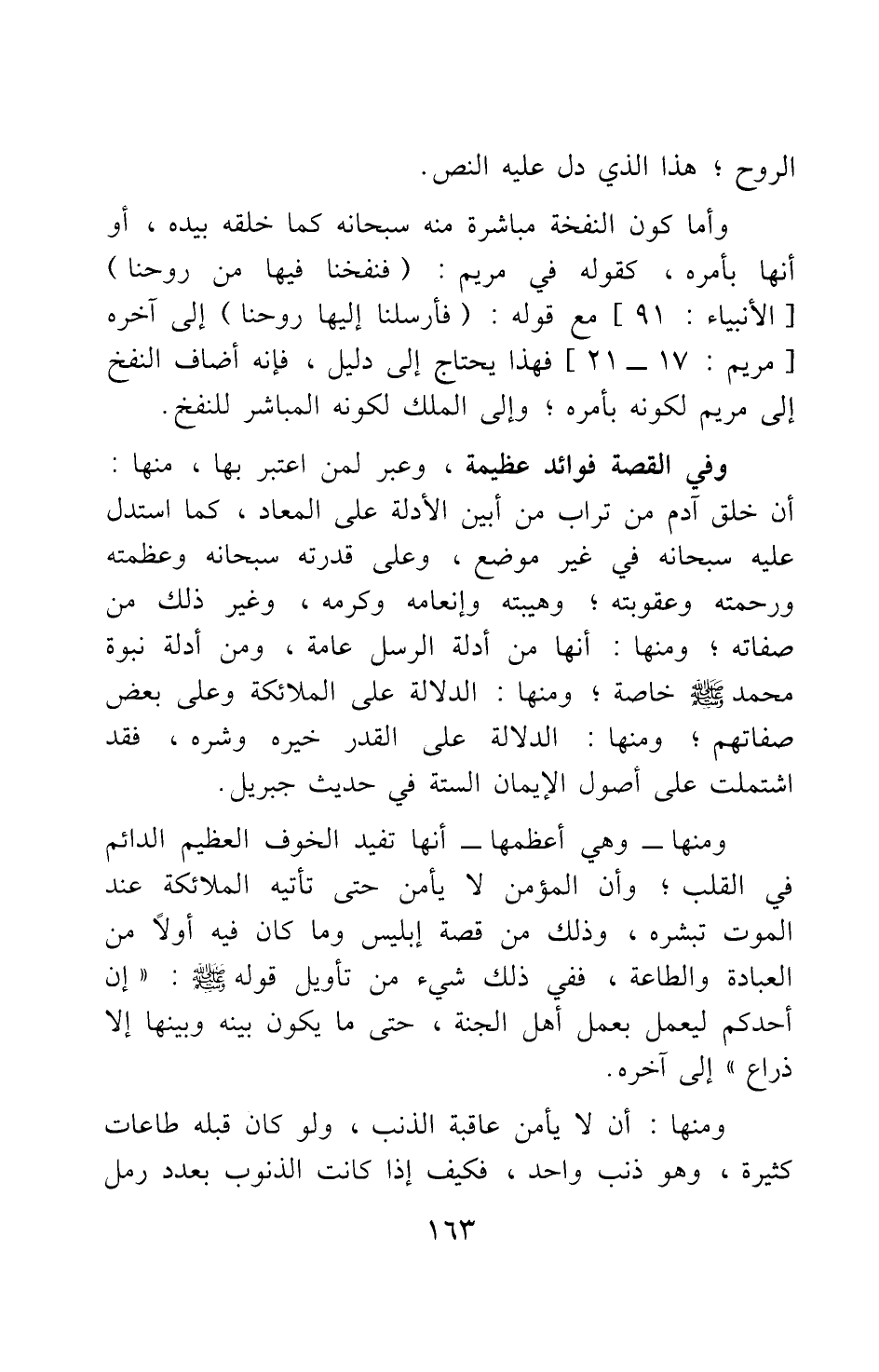 الروح ; هذا الذي دل عليه النص. وأما كون النفخة مباشرة منه سبحانه كما خلقه بيده، أو أنها بأمره، كقوله في مريم: {فَنَفَخْنَا فِيهَا مِنْ رُوحِنَا} [سورة الأنبياء آية: 91] مع قوله: {فَأَرْسَلْنَا إِلَيْهَا رُوحَنَا} [سورة مريم آية: 17] إلى آخره فهذا يحتاج إلى دليل، فإنه أضاف النفخ إلى مريم لكونه بأمره ; وإلى الملك لكونه المباشر للنفخ.