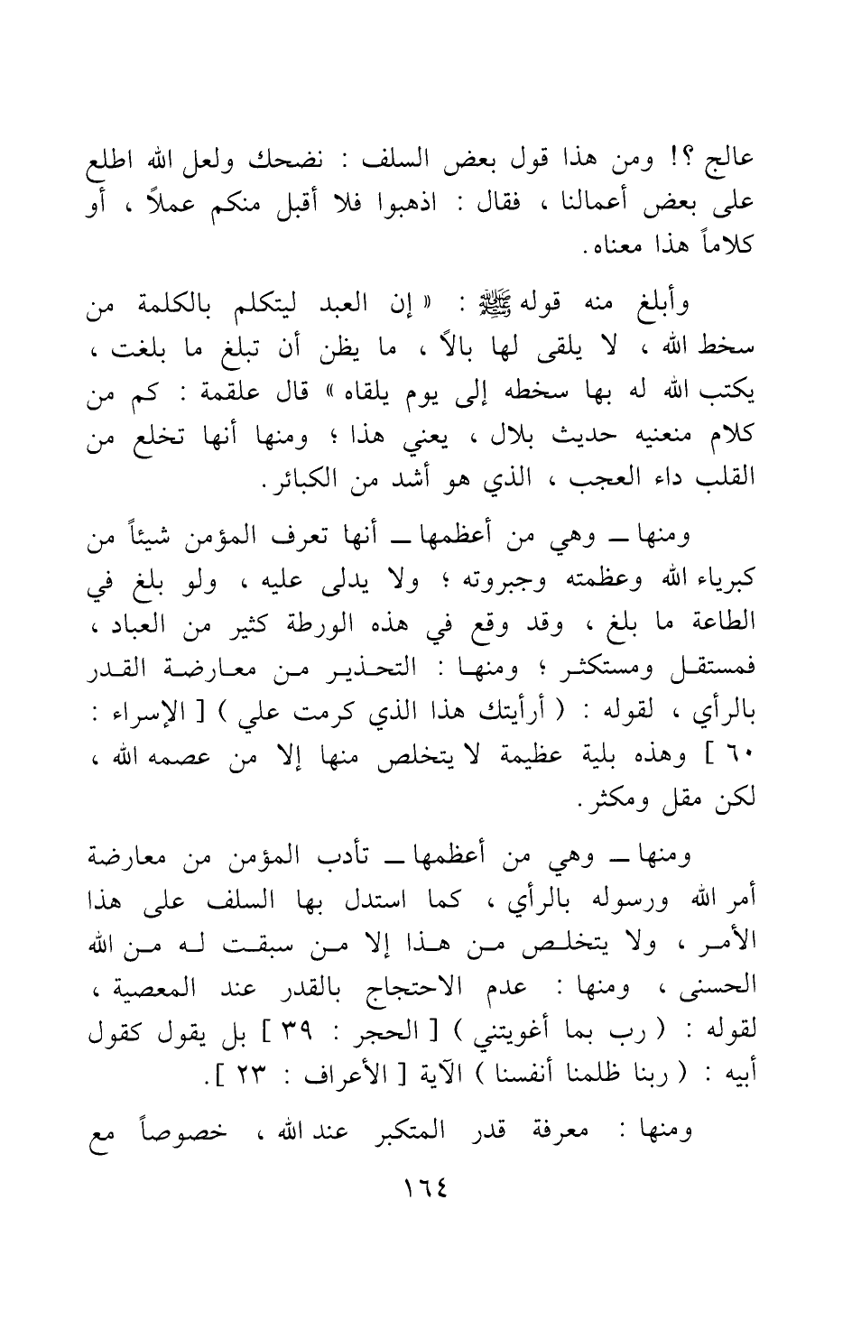 وأبلغ منه قوله صلى الله عليه وسلم: " إن العبد ليتكلم بالكلمة من سخط الله، لا يلقي لها بالا، ما يظن أن تبلغ ما بلغت، يكتب الله له بها سخطه إلى يوم يلقاه " قال علقمة: كم من كلام منعنيه حديث بلال، يعني هذا. ومنها: أنها تخلع من القلب داء العجب، الذي هو أشد من الكبائر.