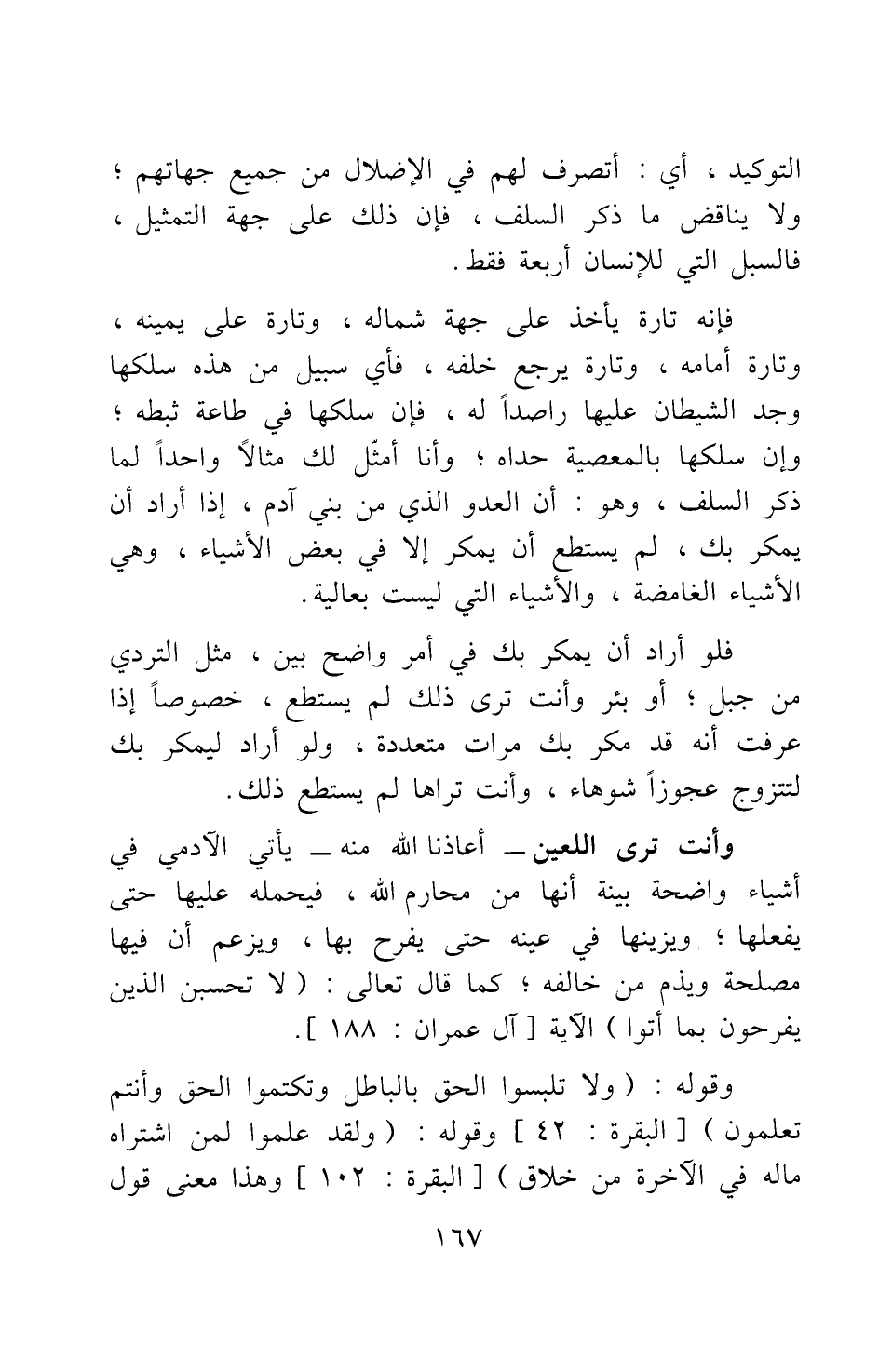 وأنت ترى اللعين - أعاذنا الله منه - يأتي الآدمي في أشياء واضحة بينة أنها من محارم الله، فيحمله عليها حتى يفعلها، ويزينها في عينه حتى يفرح بها، ويزعم أن فيها مصلحة ويذم من خالفه ; كما قال تعالى: {لا تَحْسَبَنَّ الَّذِينَ يَفْرَحُونَ بِمَا أَتَوْا} [سورة آل عمران آية: 188] الآية، وقوله: {وَلا تَلْبِسُوا الْحَقَّ بِالْبَاطِلِ وَتَكْتُمُوا الْحَقَّ وَأَنْتُمْ تَعْلَمُونَ} [سورة البقرة آية: 42] ، وقوله: {وَلَقَدْ عَلِمُوا لَمَنِ اشْتَرَاهُ مَا لَهُ فِي الآخِرَةِ مِنْ خَلاقٍ} [سورة البقرة آية: 102] ، وهذا معنى قول