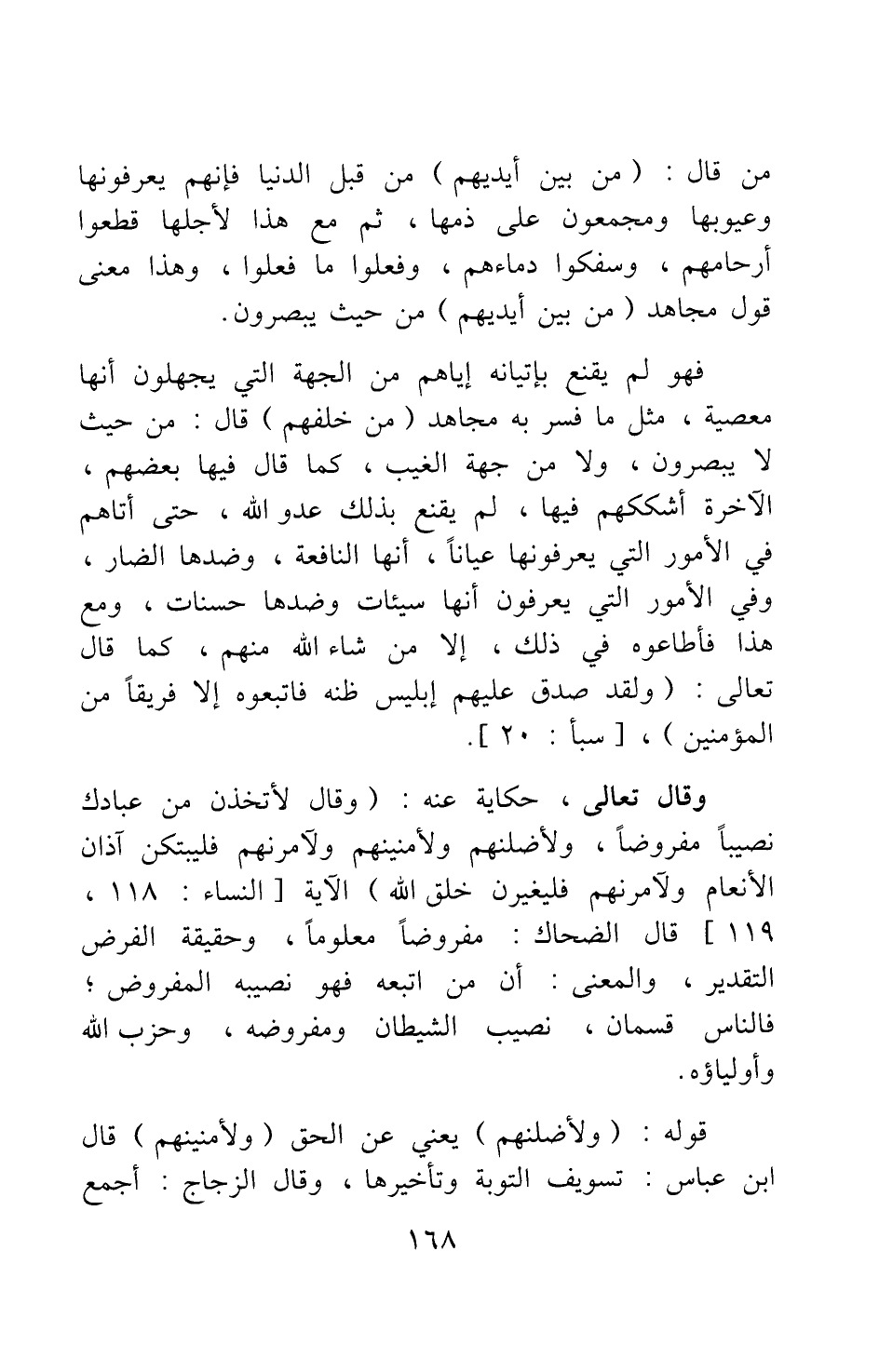 فهو لم يقنع بإتيانه إياهم من الجهة التي يجهلون أنها معصية، مثل ما فسر به مجاهد {من خلفهم} قال: "من حيث لا يبصرون، ولا من جهة الغيب"، كما قال فيها بعضهم، الآخرة أشككهم فيها، لم يقنع بذلك عدو الله، حتى أتاهم في الأمور التي يعرفونها عيانا أنها النافعة وضدها الضار، وفي الأمور التي يعرفون أنها سيئات وضدها حسنات، ومع هذا فأطاعوه في ذلك، إلا من شاء الله منهم، كما قال تعالى: {وَلَقَدْ صَدَّقَ عَلَيْهِمْ إِبْلِيسُ ظَنَّهُ فَاتَّبَعُوهُ إِلاَّ فَرِيقاً مِنَ الْمُؤْمِنِينَ} [سورة سبأ آية: 20] .