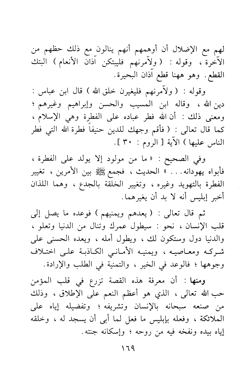 وقوله: {وَلآمُرَنَّهُمْ فَلَيُغَيِّرُنَّ خَلْقَ اللَّهِ} [سورة النساء آية: 119] قال ابن عباس: "دين الله"، وقاله ابن المسيب والحسن وإبراهيم وغيرهم ومعنى ذلك: أن الله فطر عباده على الفطرة وهي الإسلام كما قال تعالى: {فَأَقِمْ وَجْهَكَ لِلدِّينِ حَنِيفاً فِطْرَتَ اللَّهِ الَّتِي فَطَرَ النَّاسَ عَلَيْهَا} [سورة الروم آية: 30] الآية.