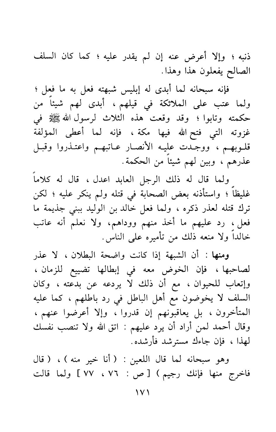 ومنها: أن الشبهة إذا كانت واضحة البطلان لا عذر لصاحبها، فإن الخوض معه في إبطالها تضييع للزمان، وإتعاب للحيوان، مع أن ذلك لا يردعه عن بدعته، وكان السلف لا يخوضون مع أهل الباطل في رد باطلهم، كما عليه المتأخرون، بل يعاقبونهم إن قدروا، وإلا أعرضوا عنهم، وقال أحمد لمن أراد أن يرد عليهم: اتق الله ولا تنصب نفسك لهذا، فإن جاءك مسترشد فأرشده وهو سبحانه لما قال اللعين: {أَنَا خَيْرٌ مِنْهُ} [سورة ص آية: 76] {قَالَ فَاخْرُجْ مِنْهَا فَإِنَّكَ رَجِيمٌ} [سورة ص آية: 77] ، ولما قالت