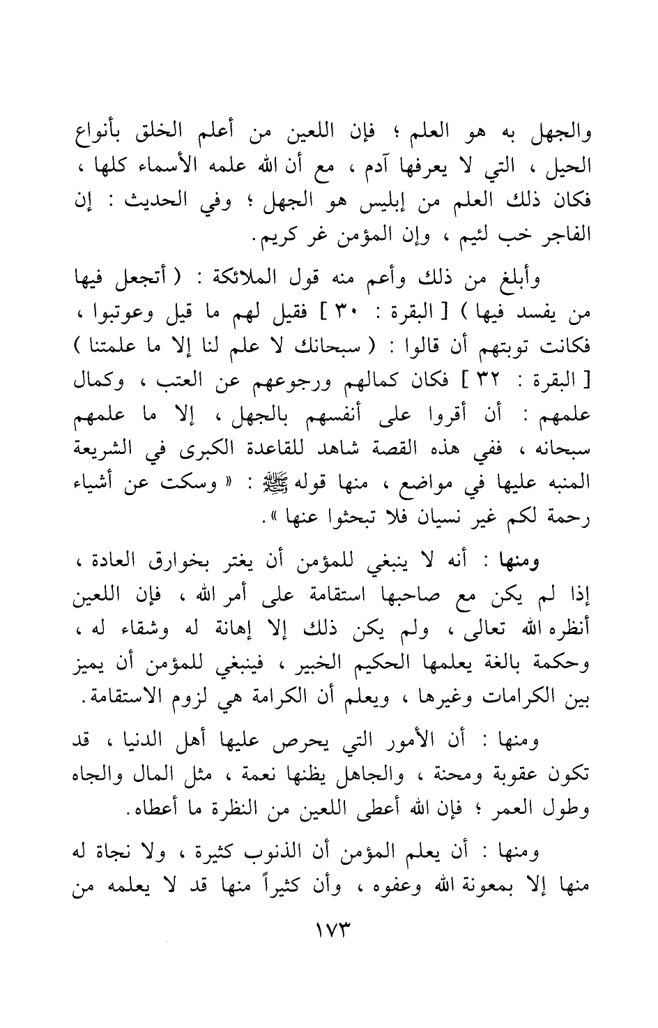 والجهل به هو العلم ; فإن اللعين من أعلم الخلق بأنواع الحيل التي لا يعرفها آدم، مع أن الله علمه الأسماء كلها، فكان ذلك العلم من إبليس هو الجهل، وفي الحديث: "إن الفاجر خب لئيم، وإن المؤمن غر كريم"، وأبلغ من ذلك وأعم منه قول الملائكة: {أَتَجْعَلُ فِيهَا مَنْ يُفْسِدُ فِيهَا} [سورة البقرة آية: 30] فقيل لهم ما قيل وعوتبوا، فكانت توبتهم أن قالوا: {سُبْحَانَكَ لا عِلْمَ لَنَا إِلاَّ مَا عَلَّمْتَنَا} [سورة البقرة آية: 32] ، فكان كمالهم ورجوعهم عن العتب، وكمال علمهم أن أقروا على أنفسهم بالجهل، إلا ما علمهم سبحانه، ففي هذه القصة شاهد للقاعدة الكبرى في الشريعة المنبه عليها في مواضع، منها قوله صلى الله عليه وسلم: " وسكت عن أشياء رحمة لكم غير نسيان فلا تبحثوا عنها ".