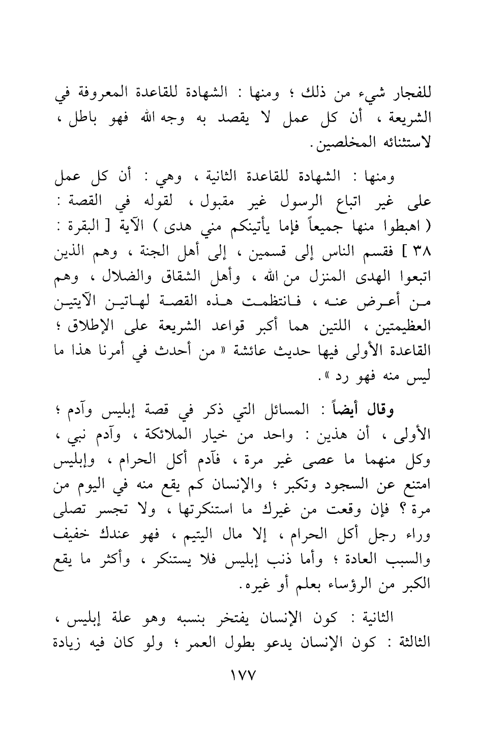 ومنها: الشهادة للقاعدة الثانية وهي: أن كل عمل على غير اتباع الرسول غير مقبول، لقوله في القصة: {اهْبِطُوا مِنْهَا جَمِيعاً فَإِمَّا يَأْتِيَنَّكُمْ مِنِّي هُدىً} [سورة البقرة آية: 38] الآية، فقسم الناس إلى قسمين: إلى أهل الجنة وهم الذين اتبعوا الهدى المنزل من الله، وأهل الشقاق والضلال وهم من أعرض عنه؛ فانتظمت هذه القصة لهاتين الآيتين العظيمتين، اللتين هما أكبر قواعد الشريعة على الإطلاق. القاعدة الأولى فيها حديث عائشة: "من أحدث في أمرنا هذا ما ليس منه فهو رد " 1.