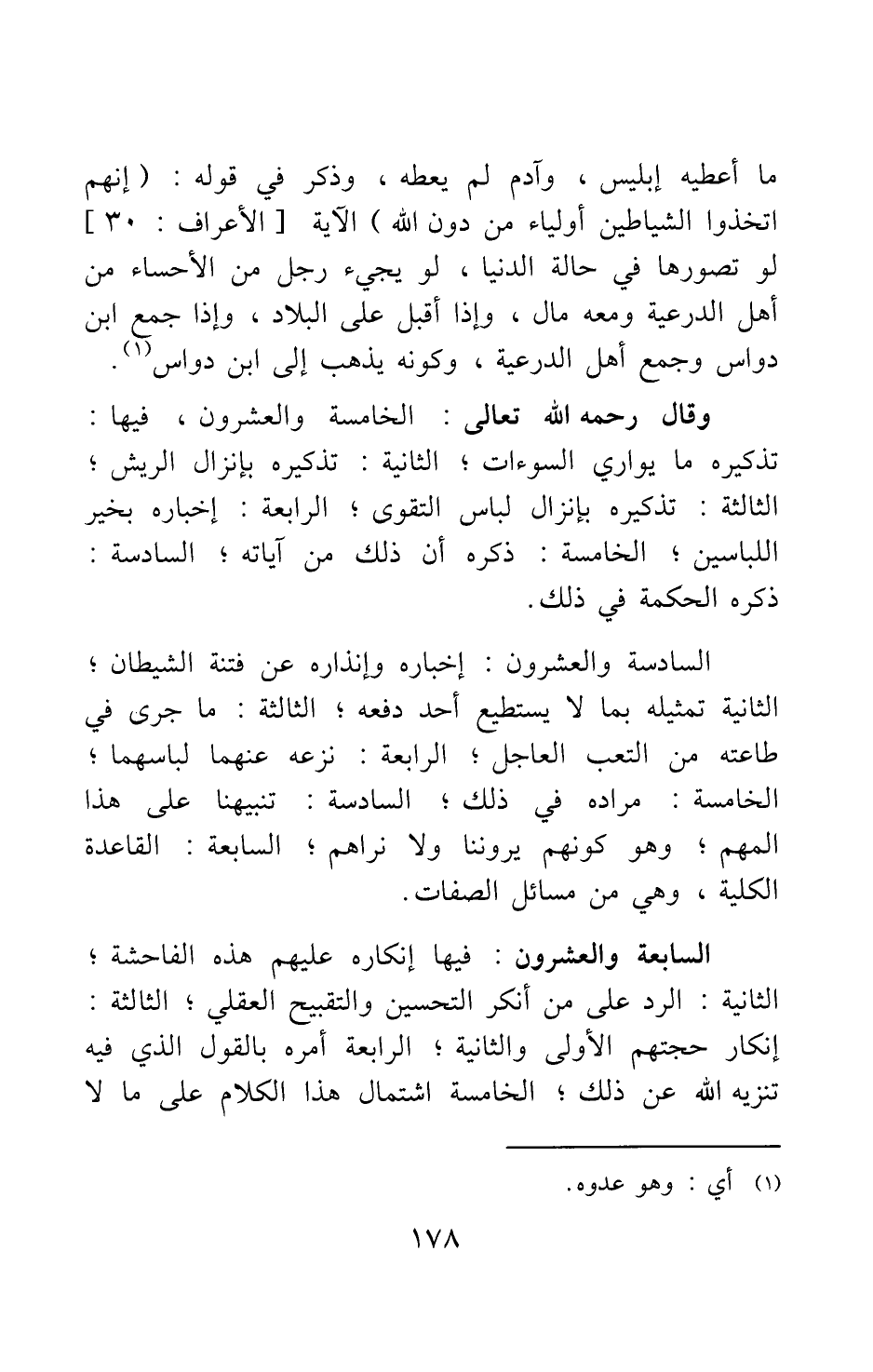 ما أعطيه إبليس؛ وآدم لم يعطه. وذكر في قوله: {إِنَّهُمُ اتَّخَذُوا الشَّيَاطِينَ أَوْلِيَاءَ مِنْ دُونِ اللَّهِ} [سورة الأعراف آية: 30] الآية، لو تصورها في حالة الدنيا، لو يجيء رجل من الأحساء من أهل الدرعية ومعه مال، وإذا أقبل على البلاد، وإذا جمع ابن دواس وجمع أهل الدرعية، وكونه يذهب إلى ابن دواس. 1