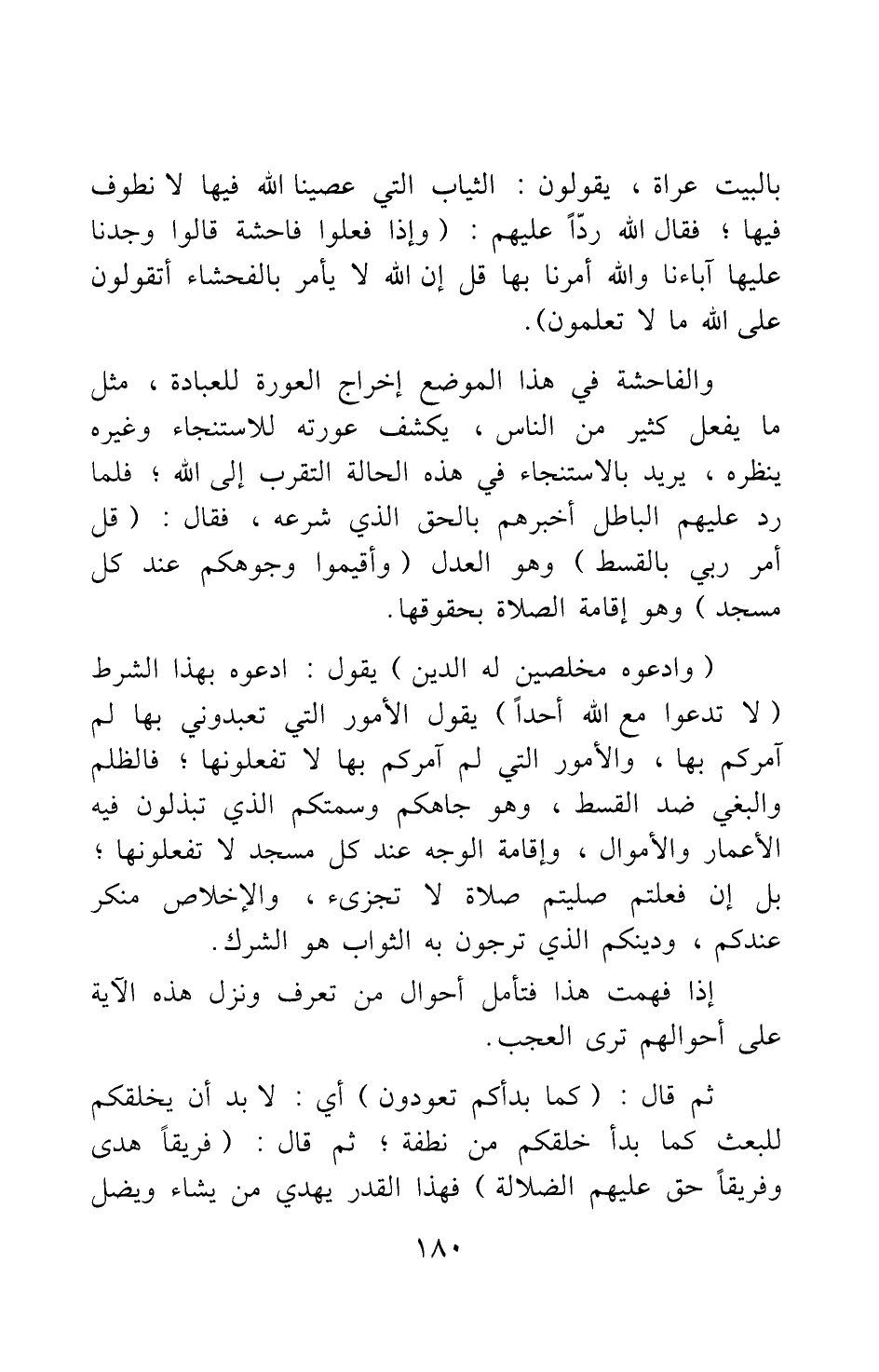 والفاحشة في هذا الموضع إخراج العورة للعبادة، مثل ما يفعل كثير من الناس، يكشف عورته للاستنجاء وغيره ينظره، يريد بالاستنجاء في هذه الحالة التقرب إلى الله. فلما رد عليهم الباطل أخبرهم بالحق الذي شرعه، فقال: {قُلْ أَمَرَ رَبِّي بِالْقِسْطِ} [سورة الأعراف آية: 29] وهو: العدل، {وَأَقِيمُوا وُجُوهَكُمْ عِنْدَ كُلِّ مَسْجِدٍ} [سورة الأعراف آية: 29] وهو: إقامة الصلاة بحقوقها. {وَادْعُوهُ مُخْلِصِينَ لَهُ الدِّينَ}