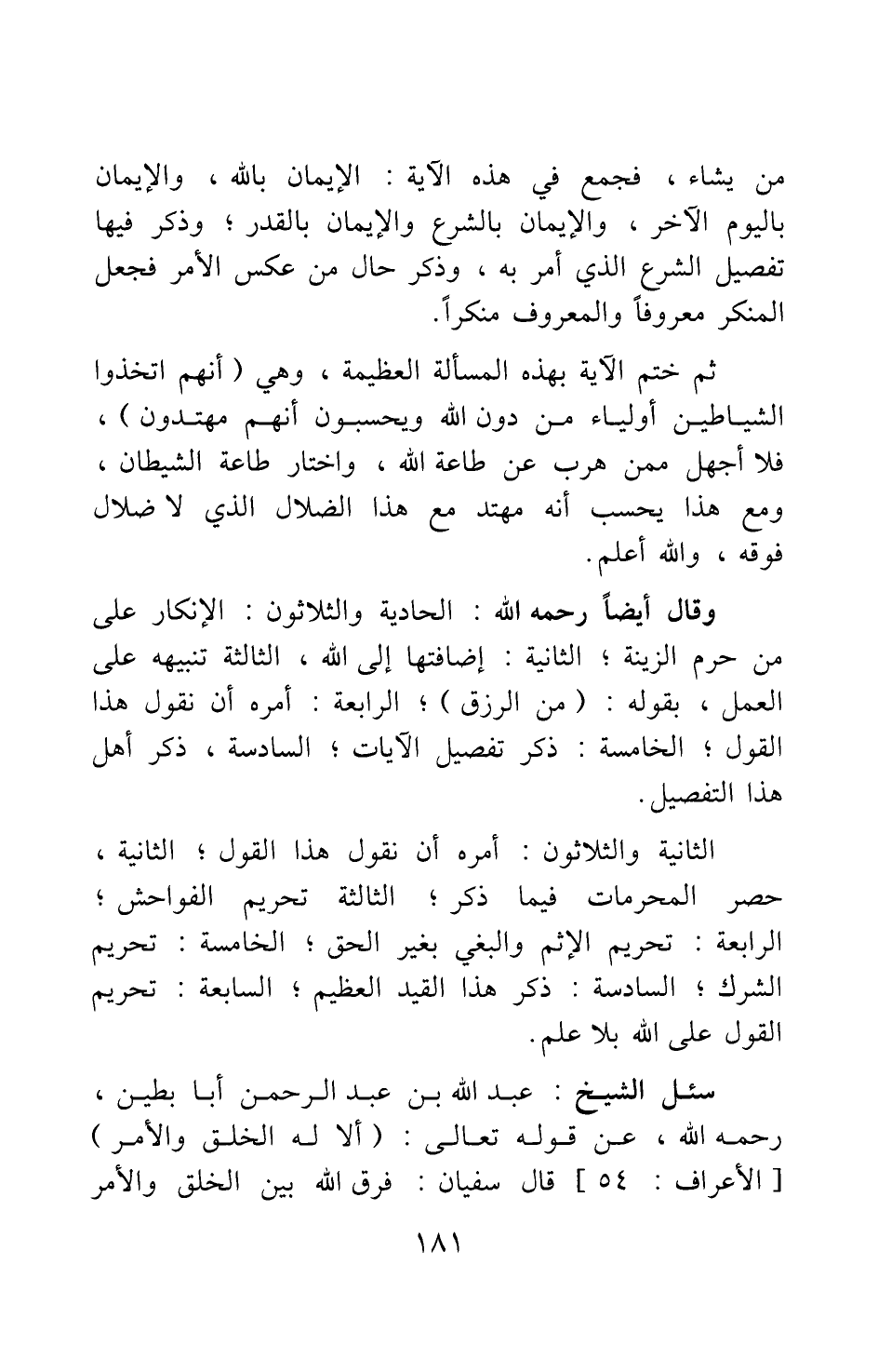 وقال أيضا رحمه الله: الحادية والثلاثون: الإنكار على من حرم الزينة. الثانية: إضافتها إلى الله، الثالثة تنبيهه على العمل، بقوله: {من الرزق} . الرابعة: أمره أن نقول هذا القول. الخامسة: ذكر تفصيل الآيات. السادسة: ذكر أهل هذا التفصيل.