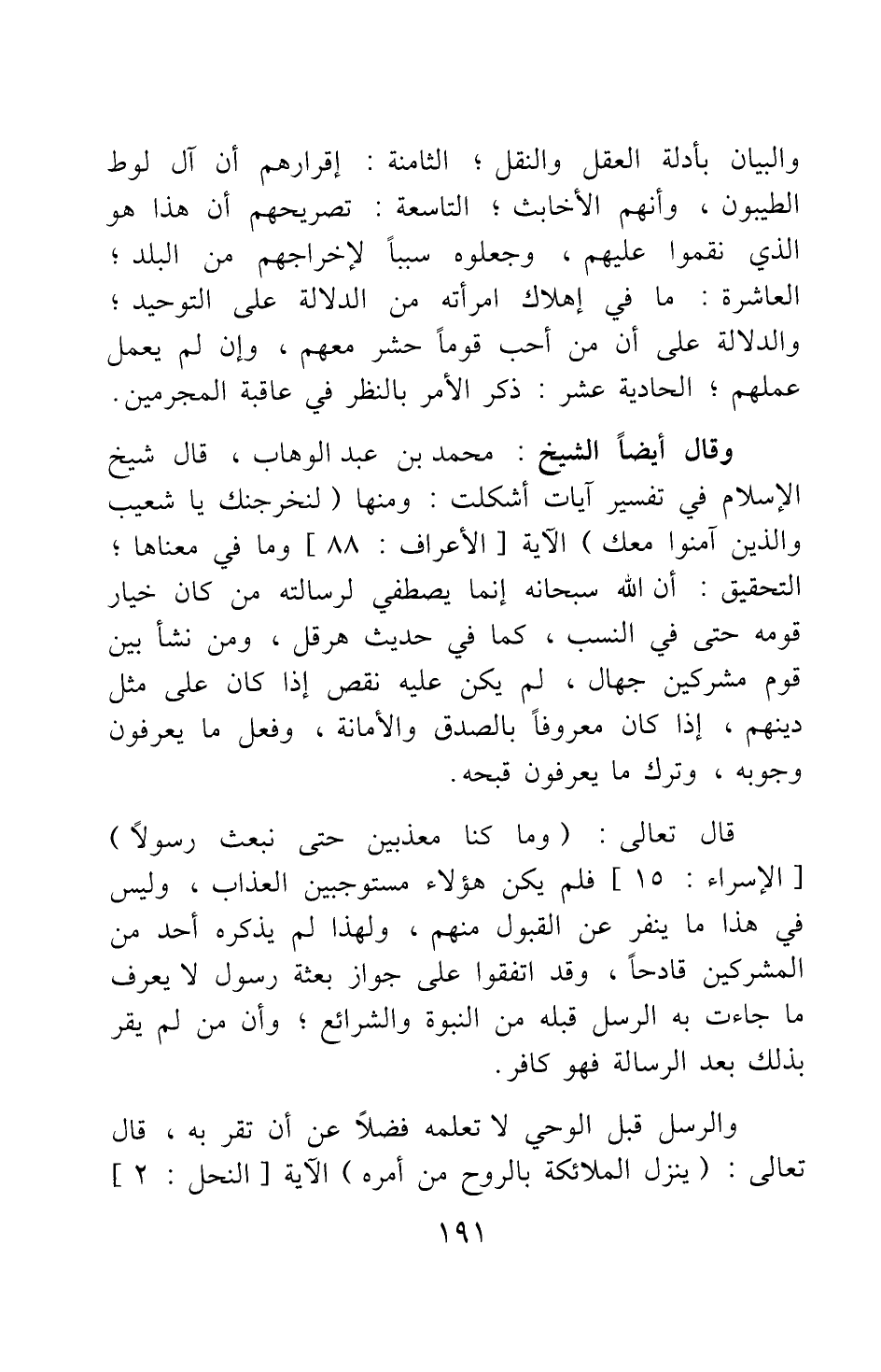 وقال أيضا الشيخ محمد بن عبد الوهاب: قال شيخ الإسلام في تفسير آيات أشكلت: ومنها {لَنُخْرِجَنَّكَ يَا شُعَيْبُ وَالَّذِينَ آمَنُوا مَعَكَ} [سورة الأعراف آية: 88] الآية وما في معناها: التحقيق أن الله سبحانه إنما يصطفي لرسالته من كان خيار قومه حتى في النسب، كما في حديث هرقل، ومن نشأ بين قوم مشركين جهال لم يكن عليه نقص إذا كان على مثل دينهم، إذا كان معروفا بالصدق والأمانة، وفعل ما يعرفون وجوبه، وترك ما يعرفون قبحه.