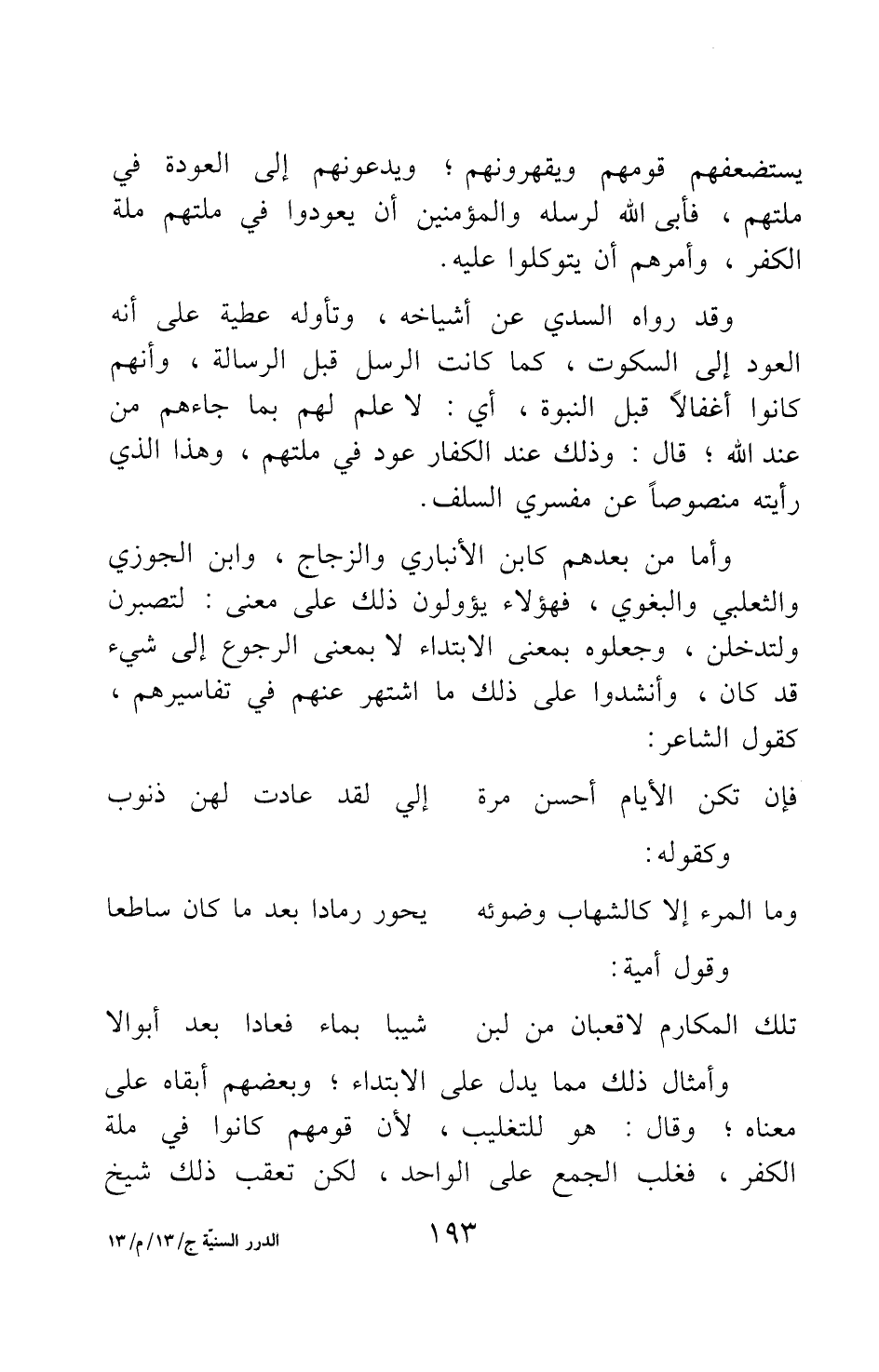 وأمثال ذلك مما يدل على الابتداء، وبعضهم أبقاه على معناه ; وقال: هو للتغليب; لأن قومهم كانوا في ملة الكفر، فغلب الجمع على الواحد، لكن تعقب ذلك شيخ