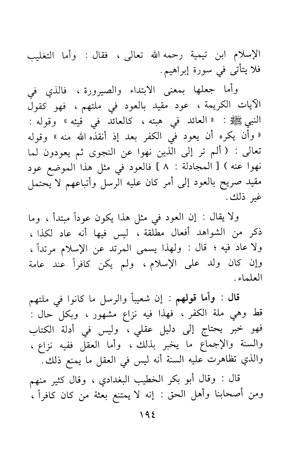 ولا يقال: إن العود في مثل هذا يكون عودا مبتدأ، وما ذكر من الشواهد أفعال مطلقة، ليس فيها أنه عاد لكذا، ولا عاد فيه ; قال: ولهذا يسمى المرتد عن الإسلام مرتدا، وإن كان ولد على الإسلام، ولم يكن كافرا عند عامة العلماء.