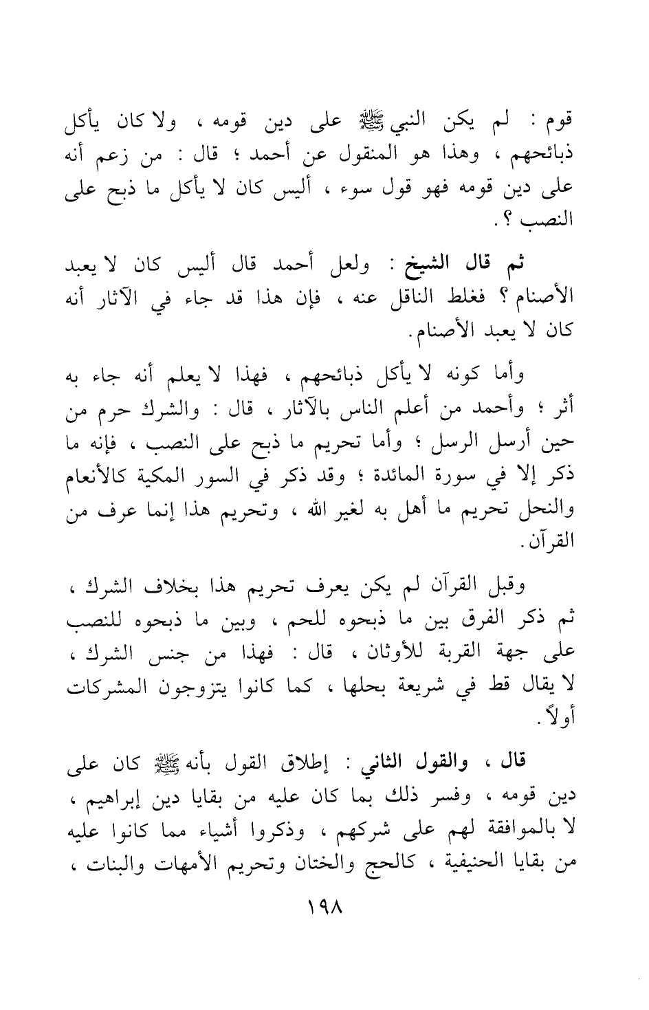 وأما كونه لايأكل ذبائحهم، فهذا لا يعلم أنه جاء به أثر ; وأحمد من أعلم الناس بالآثار، قال: والشرك حرم من حين أرسل الرسل ; وأما تحريم ما ذبح على النصب، فإنه ما ذكر إلا في سورة المائدة ; وقد ذكر في السور المكية كالأنعام والنحل تحريم ما أهل به لغير الله، وتحريم هذا إنما عرف من القرآن.