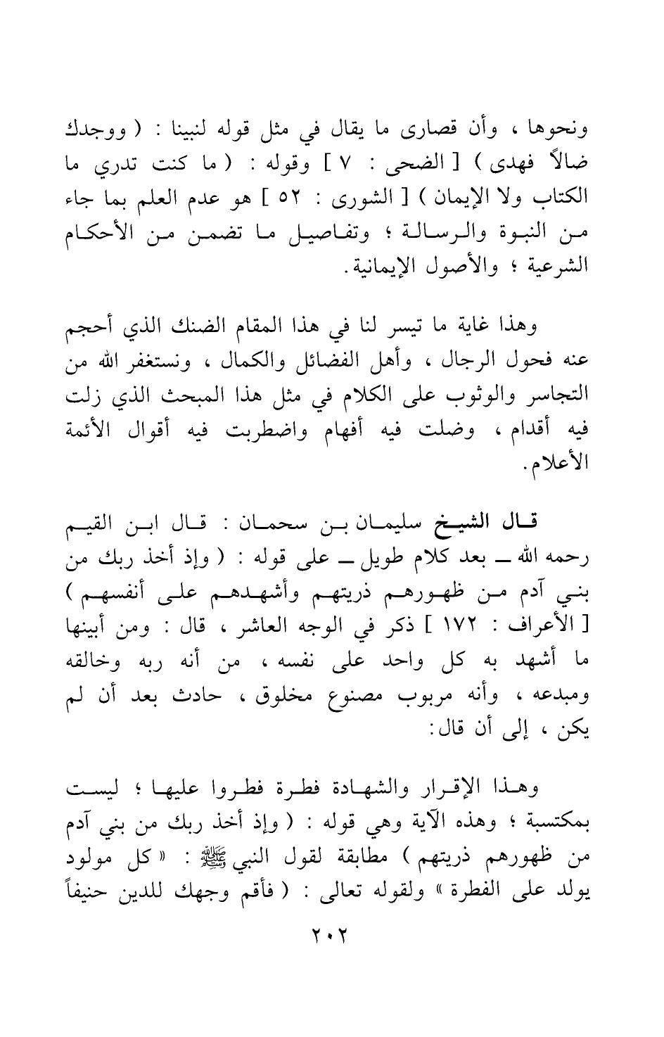 قال الشيخ سليمان بن سحمان: قال ابن القيم رحمه الله - بعد كلام طويل - على قوله: {وَإِذْ أَخَذَ رَبُّكَ مِنْ بَنِي آدَمَ مِنْ ظُهُورِهِمْ ذُرِّيَّتَهُمْ وَأَشْهَدَهُمْ عَلَى أَنْفُسِهِمْ} [سورة الأعراف آية: 172] ذكر في الوجه العاشر، قال: ومن أبينها ما أشهد به كل واحد على نفسه، من أنه ربه وخالقه ومبدعه، وأنه مربوب مصنوع مخلوق، حادث بعد أن لم يكن، إلى أن قال: