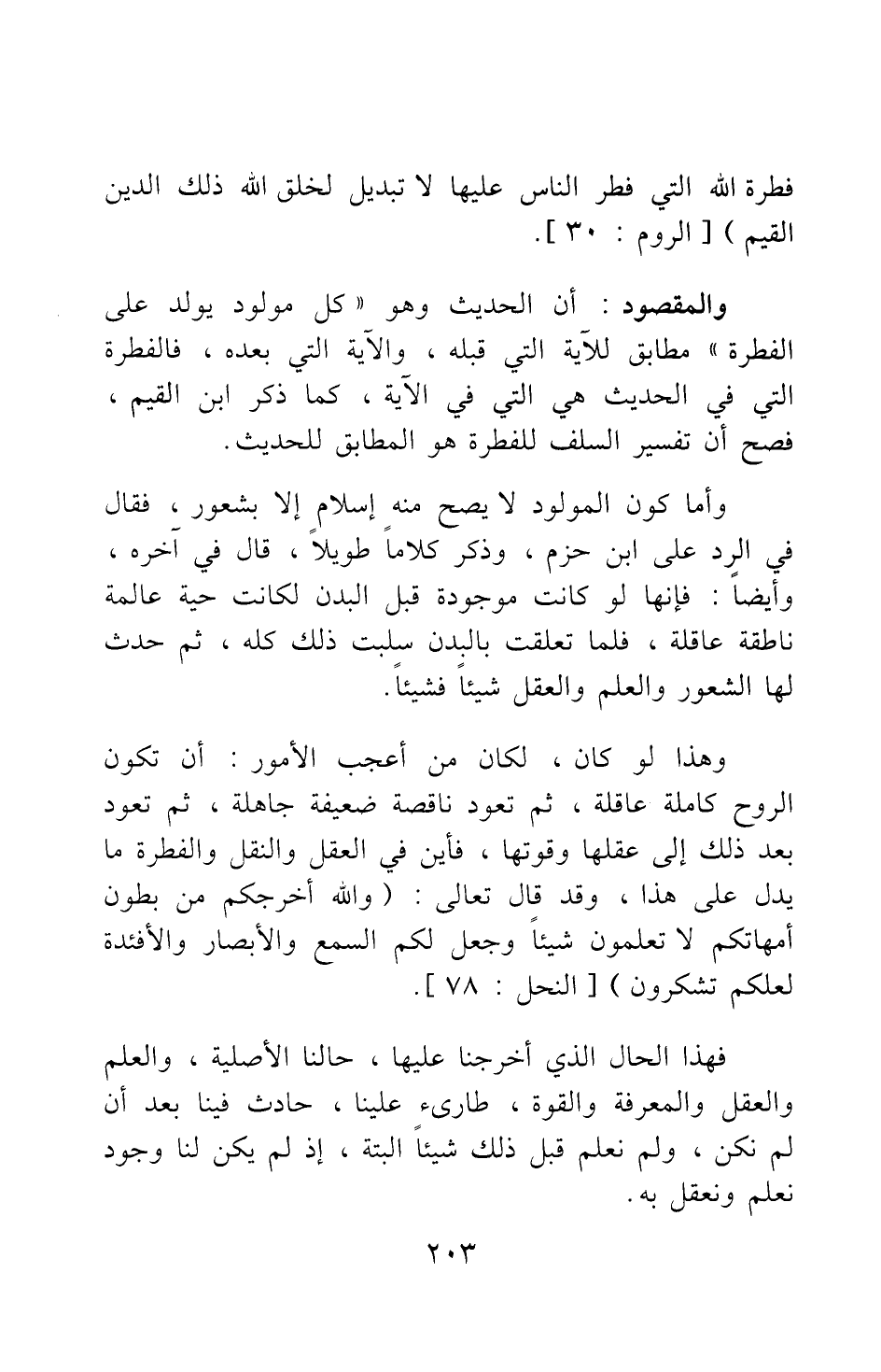 والمقصود: أن الحديث وهو: " كل مولود يولد على الفطرة " 1 مطابق للآية التي قبله والآية التي بعده، فالفطرة التي في الحديث هي التي في الآية، كما ذكر ابن القيم؛ فصح أن تفسير السلف للفطرة هو المطابق للحديث.