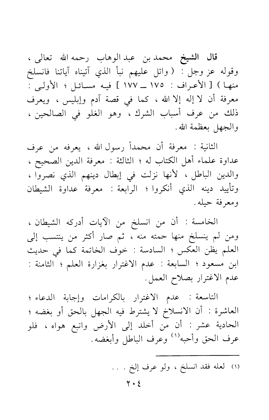 قال الشيخ محمد بن عبد الوهاب رحمه الله تعالى: وقوله عز وجل: {وَاتْلُ عَلَيْهِمْ نَبَأَ الَّذِي آتَيْنَاهُ آيَاتِنَا فَانْسَلَخَ مِنْهَا} [سورة الأعراف آية: 175] فيه مسائل: