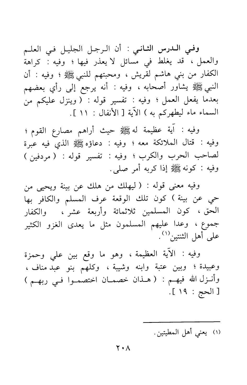 وفيه: معنى قوله: {لِيَهْلِكَ مَنْ هَلَكَ عَنْ بَيِّنَةٍ وَيَحْيَى مَنْ حَيَّ عَنْ بَيِّنَةٍ} [سورة الأنفال آية: 42] كون تلك الوقعة عرف المسلم والكافر بها الحق، كون المسلمين ثلاثمائة وأربعة عشر، والكفار جموع، وعدا عليهم المسلمون مثل ما يعدو الغزو الكثير على أهل الثنتين. 1.