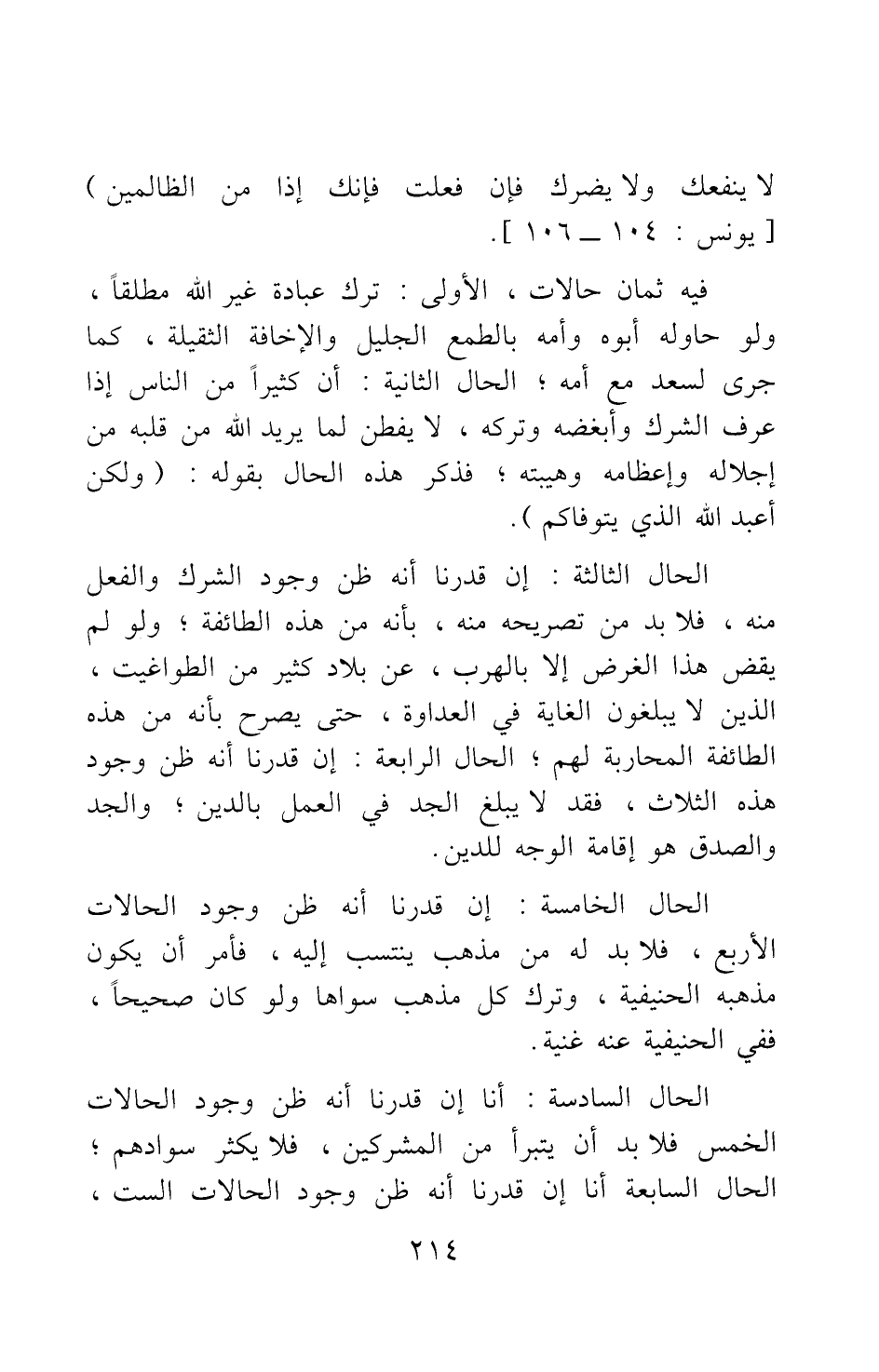 الحال الثانية: أن كثيرا من الناس إذا عرف الشرك وأبغضه وتركه، لا يفطن لما يريد الله من قلبه من إجلاله وإعظامه وهيبته; فذكر هذه الحال بقوله: {وَلَكِنْ أَعْبُدُ اللَّهَ الَّذِي يَتَوَفَّاكُمْ} [سورة يونس آية: 104] .