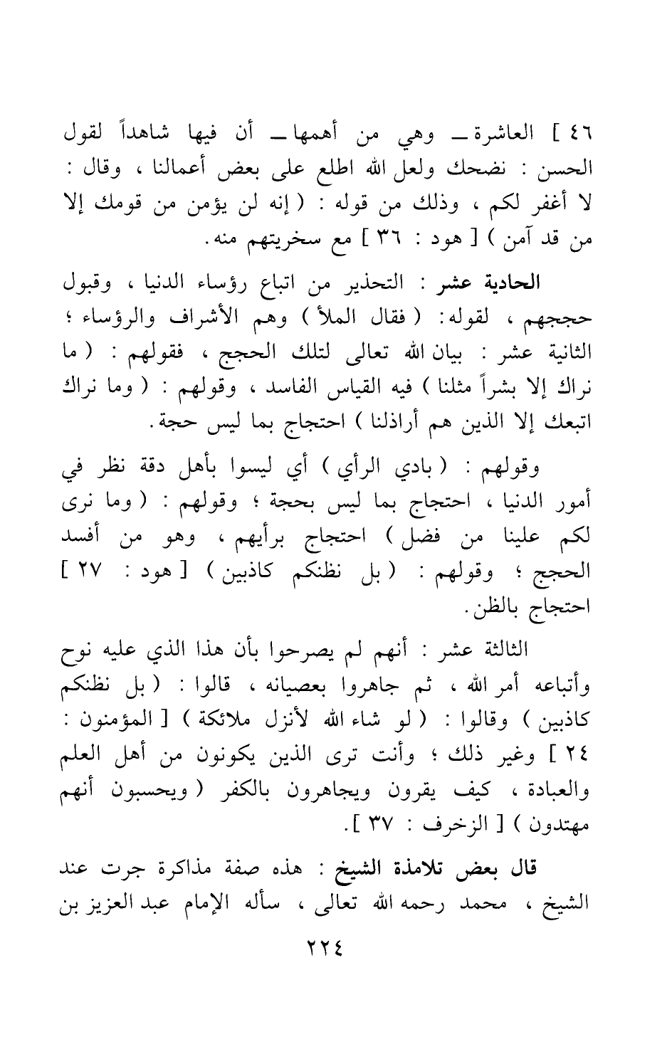 قال بعض تلامذة الشيخ: هذه صفة مذاكرة جرت عند الشيخ محمد رحمه الله تعالى، سأله الإمام عبد العزيز بن