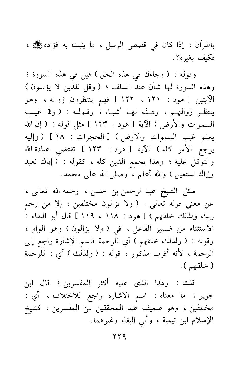 سئل الشيخ عبد الرحمن بن حسن، رحمه الله تعالى، عن معنى قوله تعالى: {وَلا يَزَالُونَ مُخْتَلِفِينَ إِلاّ مَنْ رَحِمَ رَبُّكَ وَلِذَلِكَ خَلَقَهُمْ} [سورة هود آية: 118-119] : قال أبو البقاء: الاستثناء من ضمير الفاعل في {وَلا يَزَالُونَ} وهو الواو، وقوله: {وَلِذَلِكَ خَلَقَهُمْ} أي: للرحمة، فاسم الإشارة راجع إلى الرحمة، لأنه أقرب مذكور، قوله: {وَلِذَلِكَ} أي: للرحمة {خَلَقَهُمْ} .