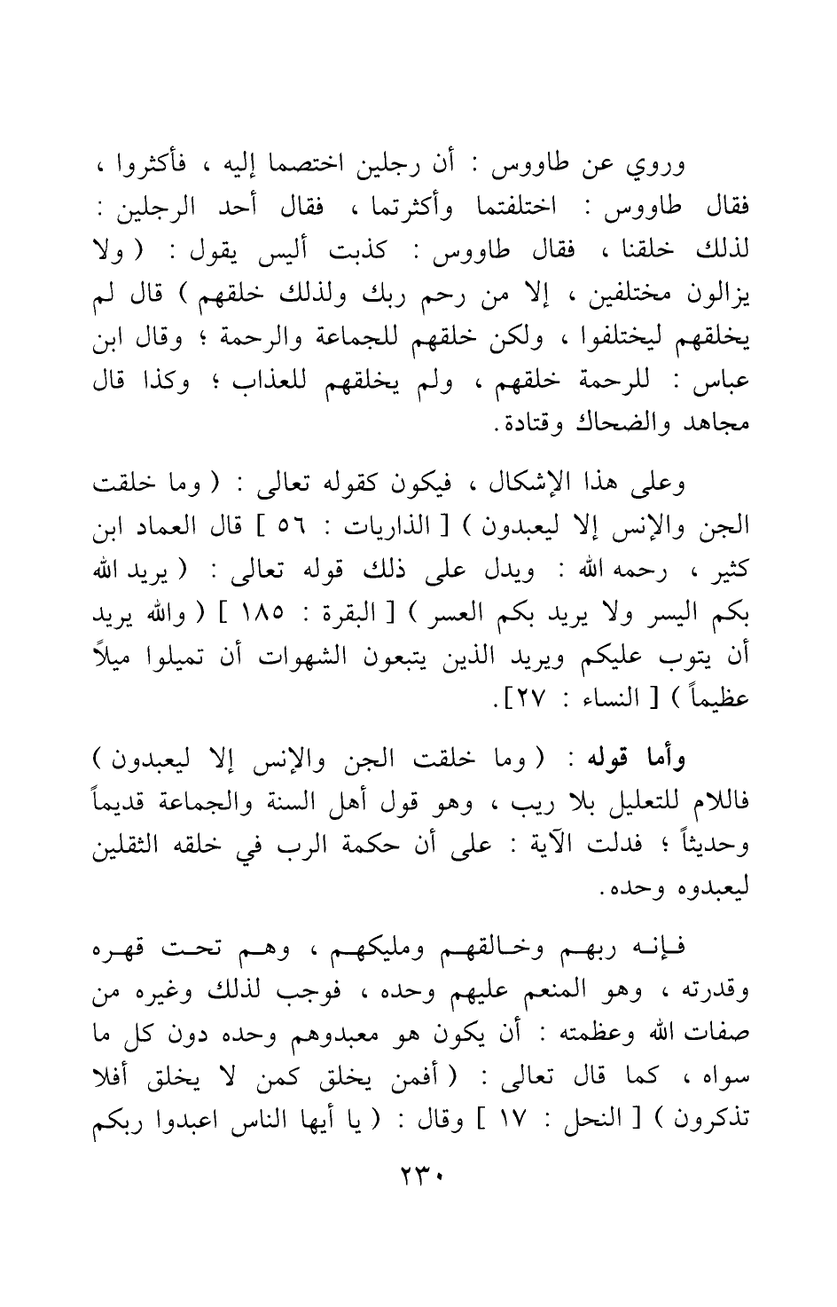 وأما قوله: {وَمَا خَلَقْتُ الْجِنَّ وَالأِنْسَ إِلاّ لِيَعْبُدُونِ} [سورة الذاريات آية: 56] فاللام للتعليل بلا ريب، وهو قول أهل السنة والجماعة قديما وحديثا; فدلت الآية على أن حكمة الرب في خلقه الثقلين ليعبدوه وحده.