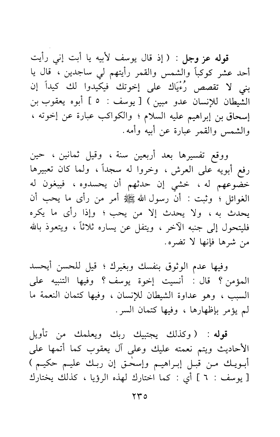 قوله عز وجل {إِذْ قَالَ يُوسُفُ لأَبِيهِ يَا أَبَتِ إِنِّي رَأَيْتُ أَحَدَ عَشَرَ كَوْكَباً وَالشَّمْسَ وَالْقَمَرَ رَأَيْتُهُمْ لِي سَاجِدِينَ قَالَ يَا بُنَيَّ لا تَقْصُصْ رُؤْياكَ عَلَى إِخْوَتِكَ فَيَكِيدُوا لَكَ كَيْدا {سورة يوسف آية: 4-5] أبوه يعقوب بن إسحاق بن إبراهيم عليه السلام; والكواكب عبارة عن إخوته، والشمس والقمر عبارة عن أبيه وأمه.