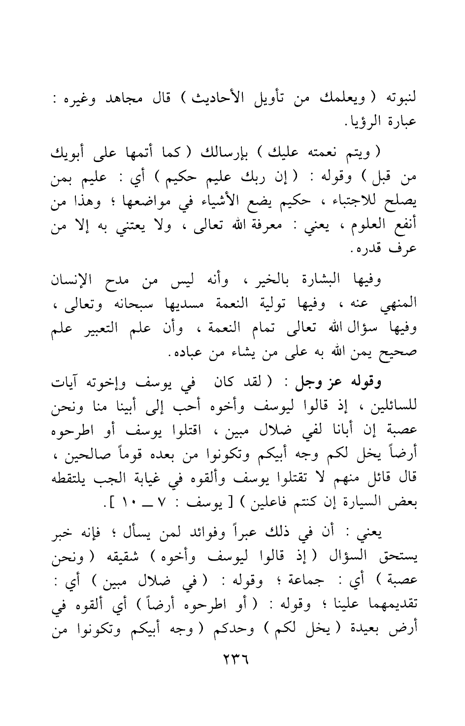وفيها: البشارة بالخير، وأنه ليس من مدح الإنسان المنهي عنه. وفيها: تولية النعمة مسديها سبحانه وتعالى. وفيها: سؤال الله تعالى تمام النعمة، وأن علم التعبير علم صحيح يمن الله به على من يشاء من عباده.