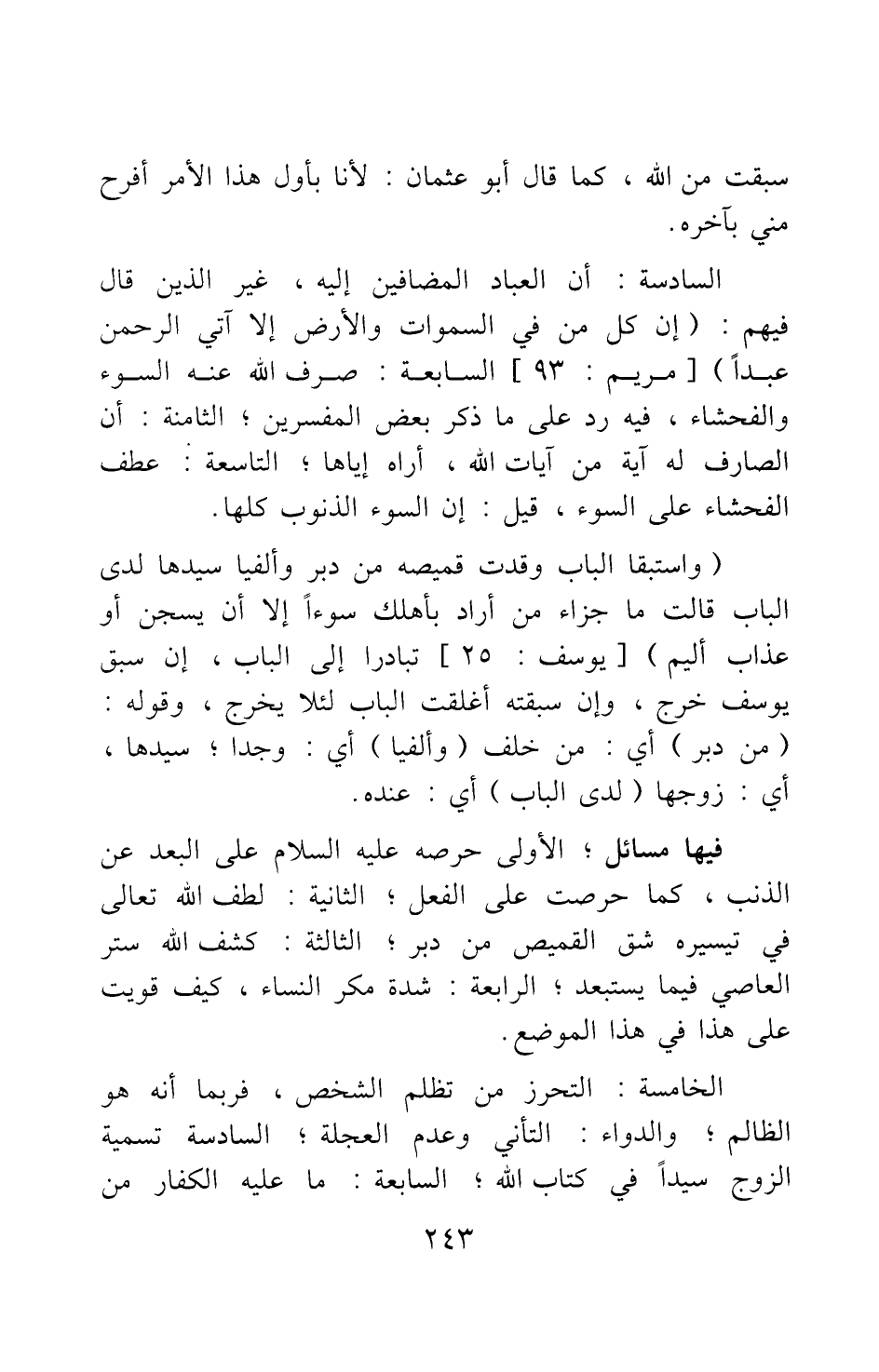 الخامسة: التحرز من تظلم الشخص، فربما أنه هو الظالم; والدواء: التأني وعدم العجلة. السادسة: تسمية الزوج سيدا في كتاب الله. السابعة: ما عليه الكفار من
